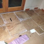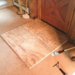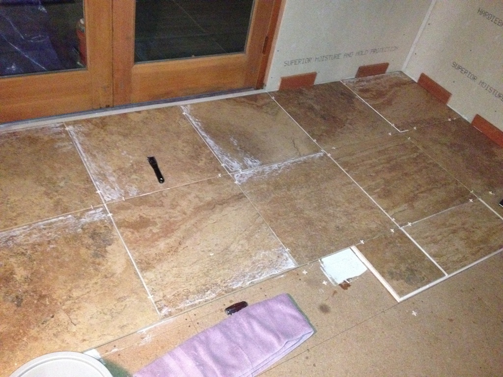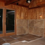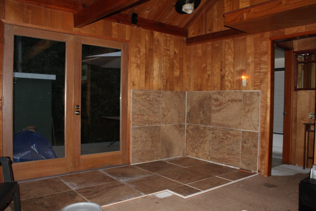 The tile layout went through a few iterations from the initial plan. The idea was to create a hearth for the wood burning stove (which goes right in the corner) and a place to take your boots off after coming in the back doors. The one thing we had to consider was furniture placement, as it’s going to limit our options of where to put things when we have some tiled areas and some hardwood floor.
