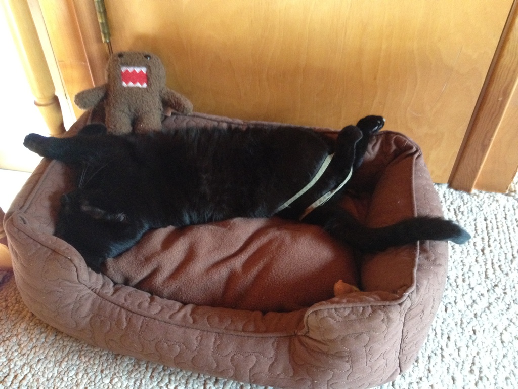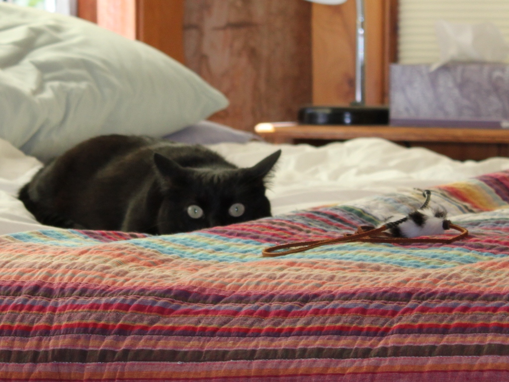 I cannot overstate the excitement, the enthusiasm, the sheer passion Inky has in hunting the Bedmonster. Daily she demands our assistance in finding the elusive beast. It slithers under the blankets, crawls in the shadows, and darts just out of reach of her dagger-like claws. When she hunts the Bedmonster, she becomes a Mayan jaguar god, a cunning and ruthless hunter that finds her prey even under the deep cover of blankets. And when she finds it, the mouse-shaped furball with leather strings attached to it, she pounces and bites and claws and kicks and twists, until it moves no more.
