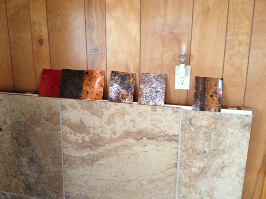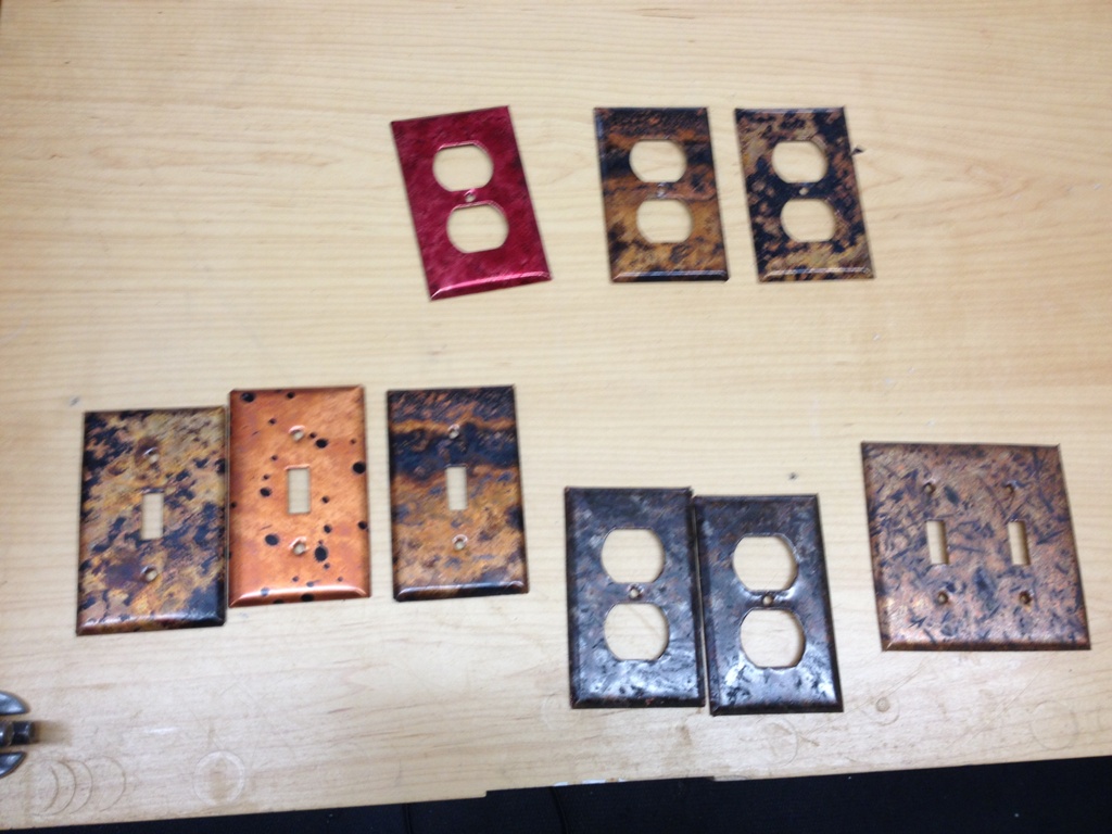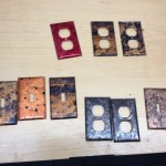 Copper SamplesWell, we were looking for copper sheets for a completely different purpose and we ordered a sample pack to see what the colors were like.  We got a variety of 36 gauge copper sheeting, each one with a decorative finish on it.  It’s like malleable foil, soft but durable.  The samples cost money so I considered them mine to do with whatever I pleased.  I decided to use them to cover some switchplates around the house.