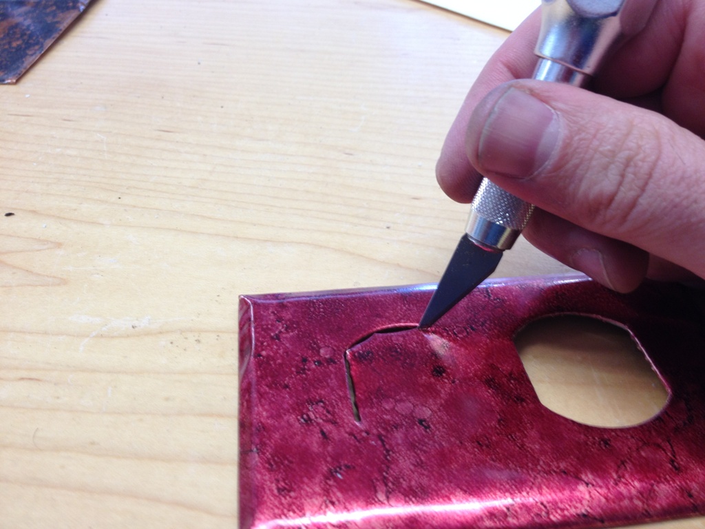 WrappedOnce you wrap it around, you can press it down to kind of see the outline of the holes you must cut.  This copper foil cut really easy; scissors cut through it like paper and all it took to punch out the holes was a dull x-acto knife.  Don’t use your pocket knife; the copper will dull it very quick and you’ll be sharpening it for two hours to get the blade right again.