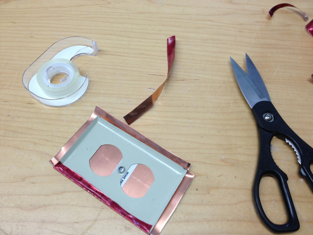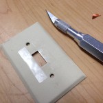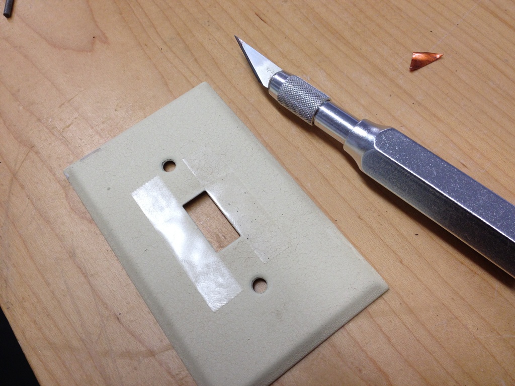Cut to SizeLike any good handyman, I have a small collection of existing switchplate covers of various sizes and materials.  It’s a good idea to use metal ones for this purpose.  You’re going to form the copper foil around them and plastic just won’t take the beating.  The cheap metal ones retail for about a dollar or two so it’s not like some huge expense.  Anyway, use metal ones for the backbone.