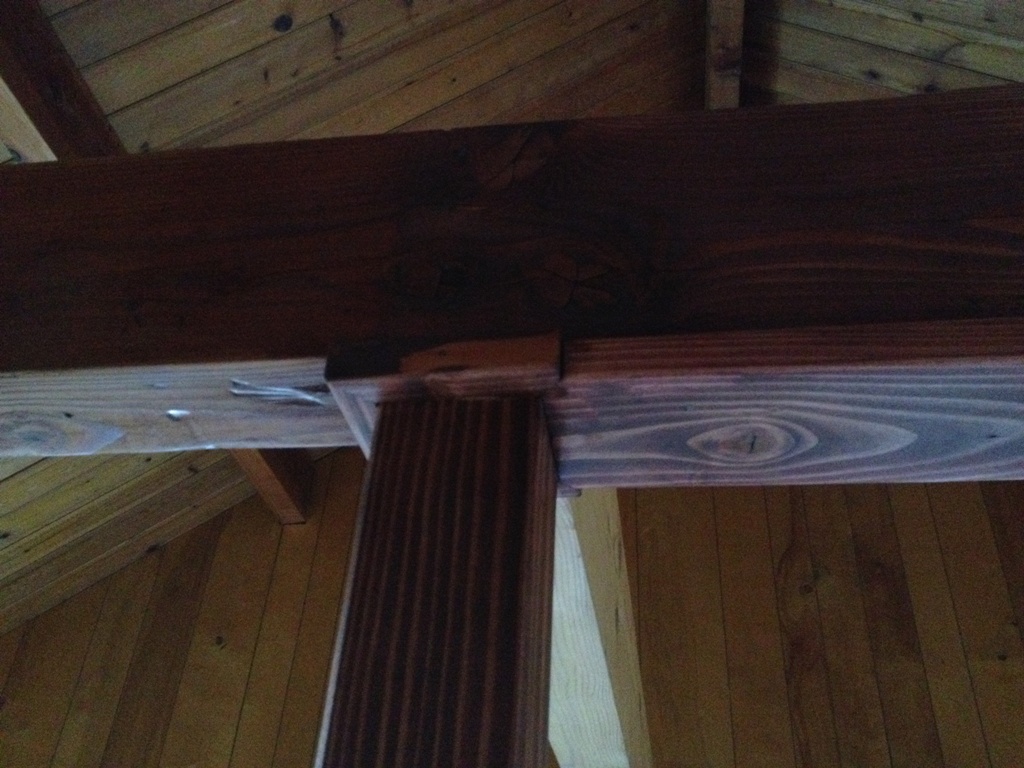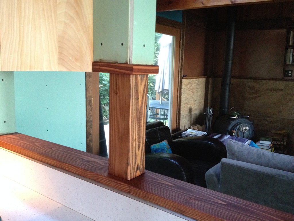 I like the way I was able to make a cap around the top of this post and join it into the false bottom that runs the inside length of the beam. The false bottom is there to make room for the light fixture, and run the electrical to it. I ran the electrical through a steel conduit so it should be fairly safe. I considered digging a channel through that beam for the electrical wire but it was too warped to do that safely and it wouldn’t even look good if I managed to do it without screwing it up. Which probably wouldn’t have happened. Putting a little slab of wood on the bottom was the way to go.