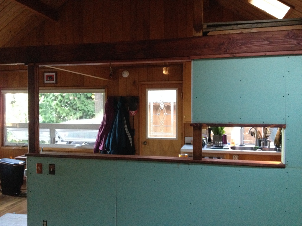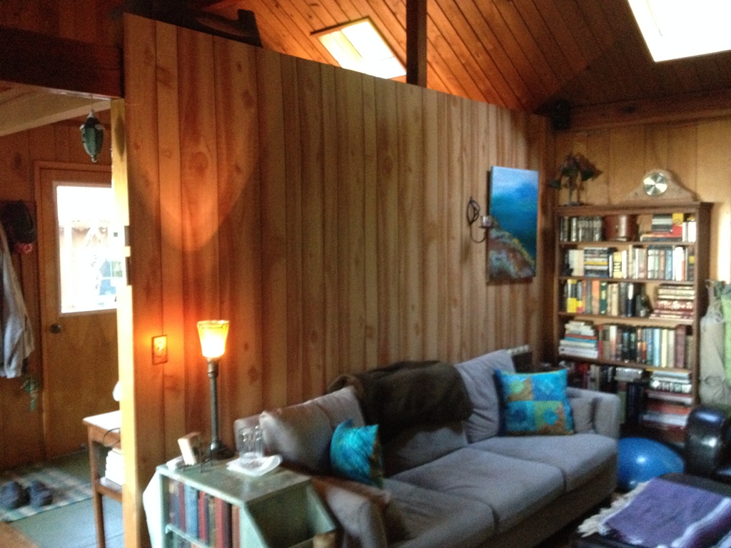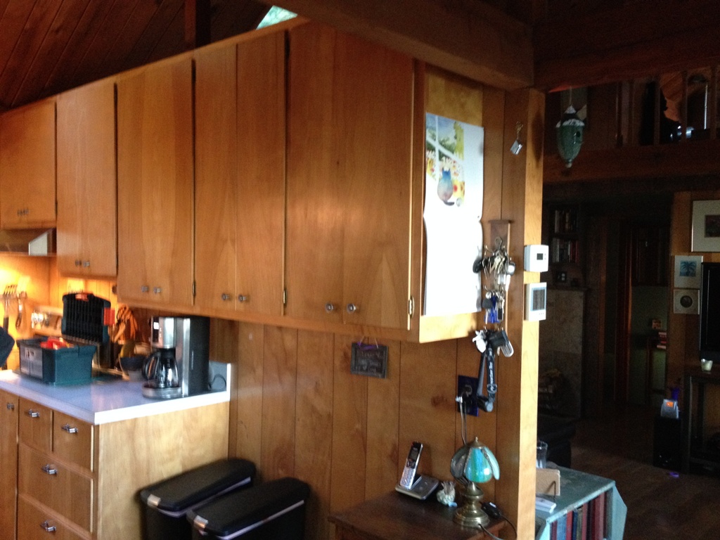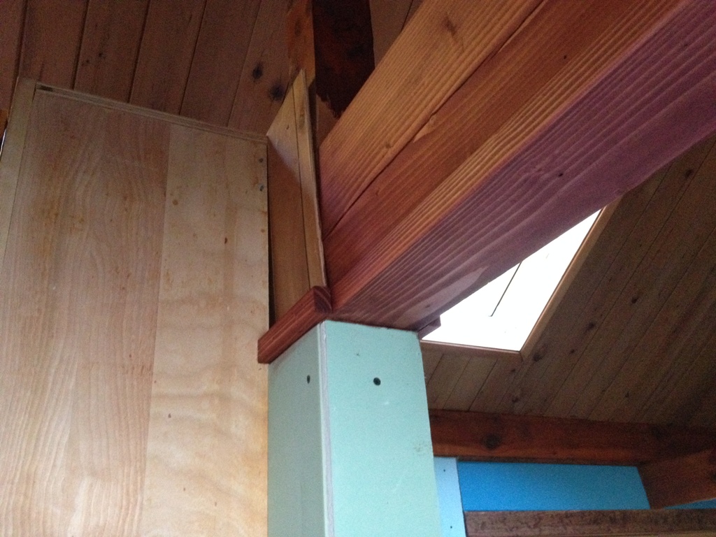 There’s still quite a bit of work to do, including more trim and finish work. This pic shows a particularly challenging area. Like all the exposed 4×8 beams in this house, this one has a nasty warp to it. The trick will be to put some wood trim around it and make it look nice and straight even though it connects to something as twisted as a bent corkscrew. I’ve got some ideas, though. It should look good in the end.