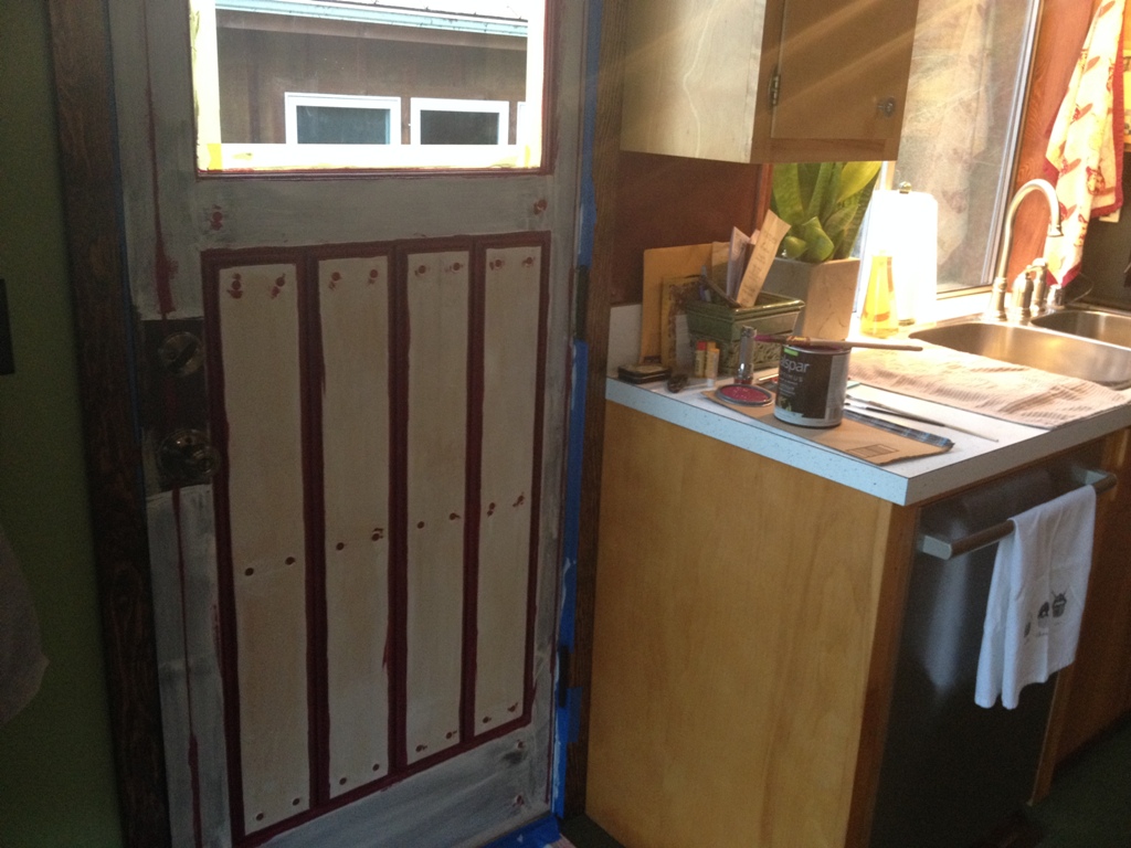 Here is the door being painted (which took about nine hours total, I think this pic was taken during hour three). We painted the inside only and left the outside stained wood. There’s a lot of detail in this door for the accent color to paint. We used two colors, a deep purple with a sort of lipstick accent color.