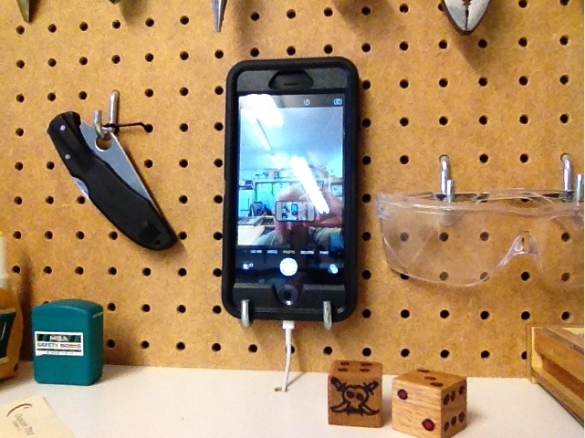 You don’t need a fancy pants phone dock. Two J-hooks on your pegboard will do the trick nicely. I drilled a hole for the charger. In my shop, the phone controls the music and it takes all these lovely pictures you’re looking at, so it’s nice when it’s in easy reach.