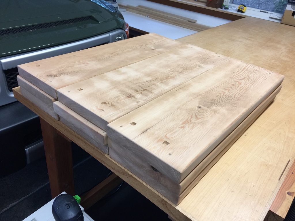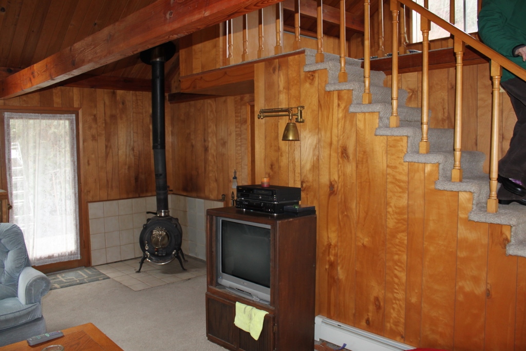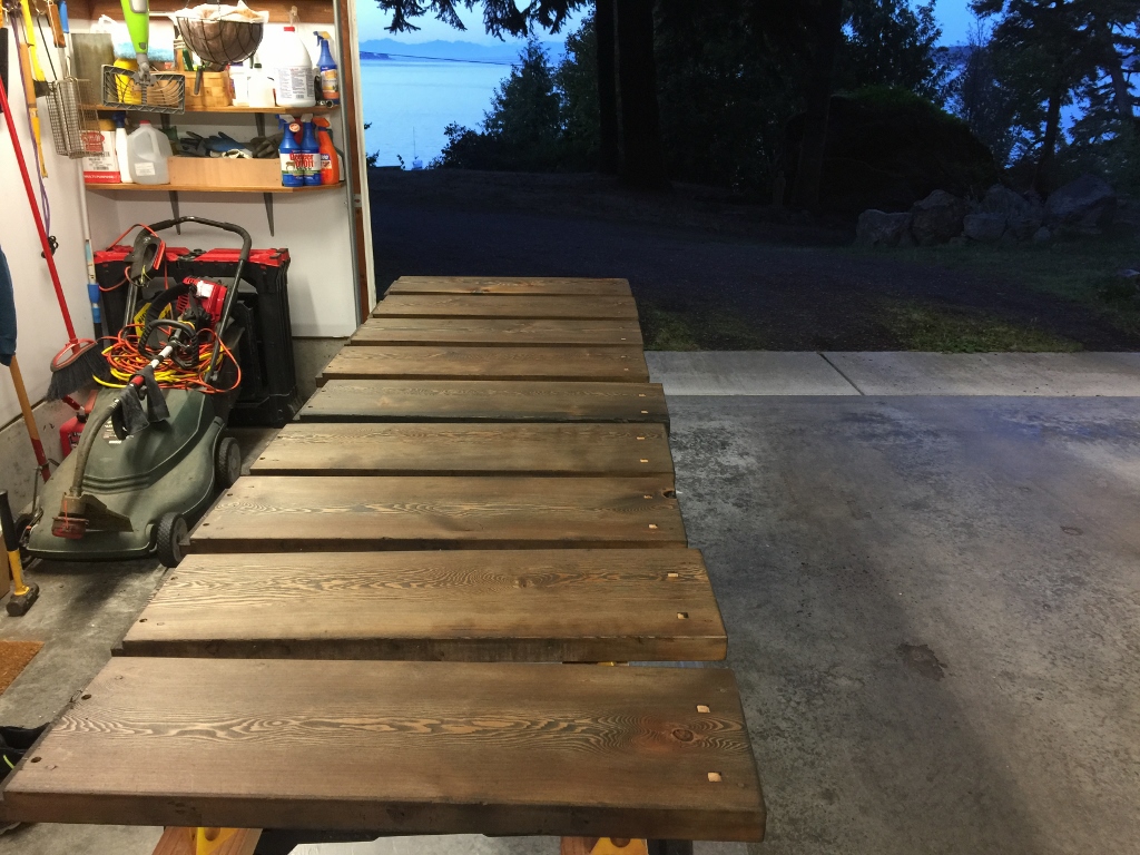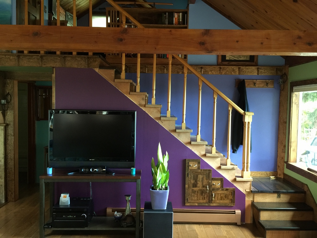 The risers have a nice, coppery color to them. That’s T-111 paneling, so it’s rough cut cedar plywood, sanded a little smooth and drowned in about a pint of spar urethane. It still retains some of its rough texture, yet is smooth enough to be cleaned by a damp cloth if necessary, and hard enough to withstand scuffs and scratches.