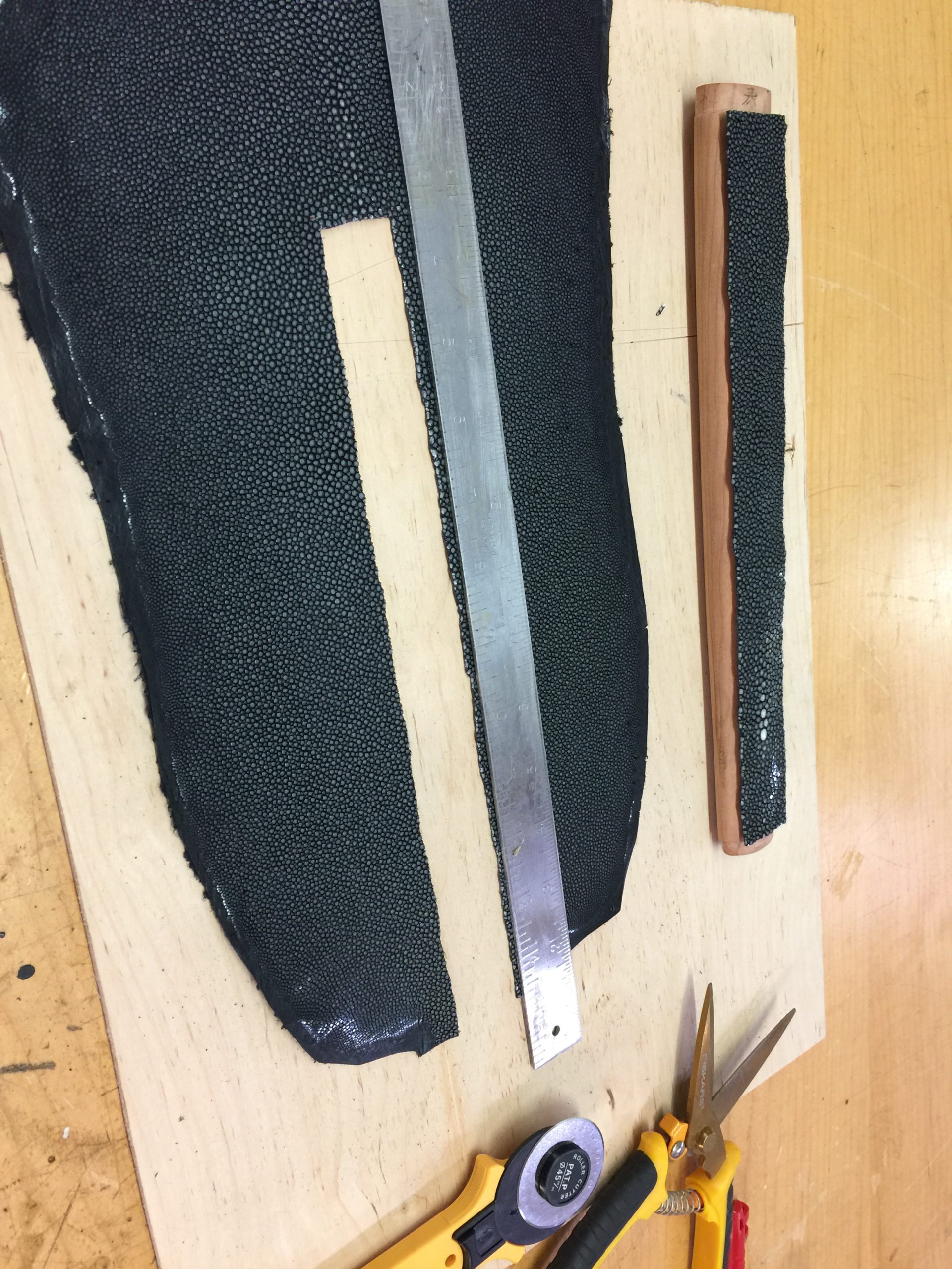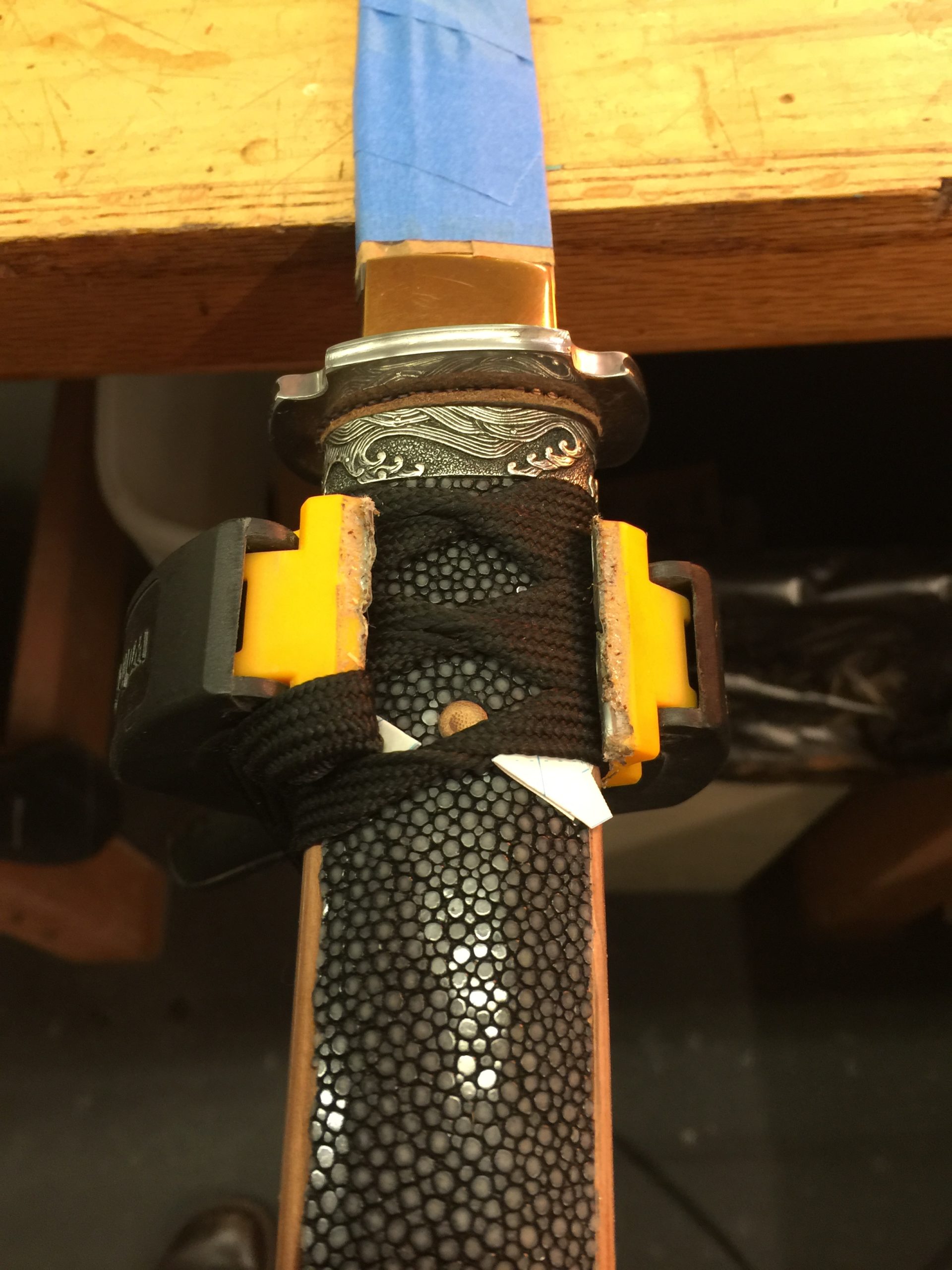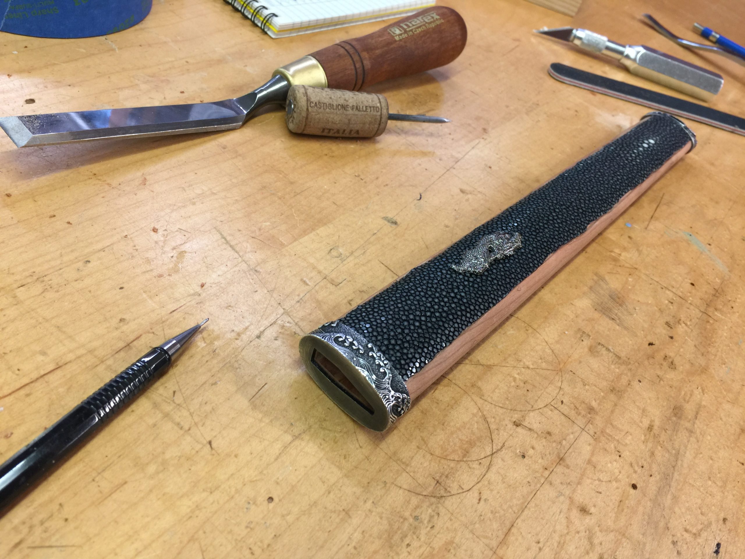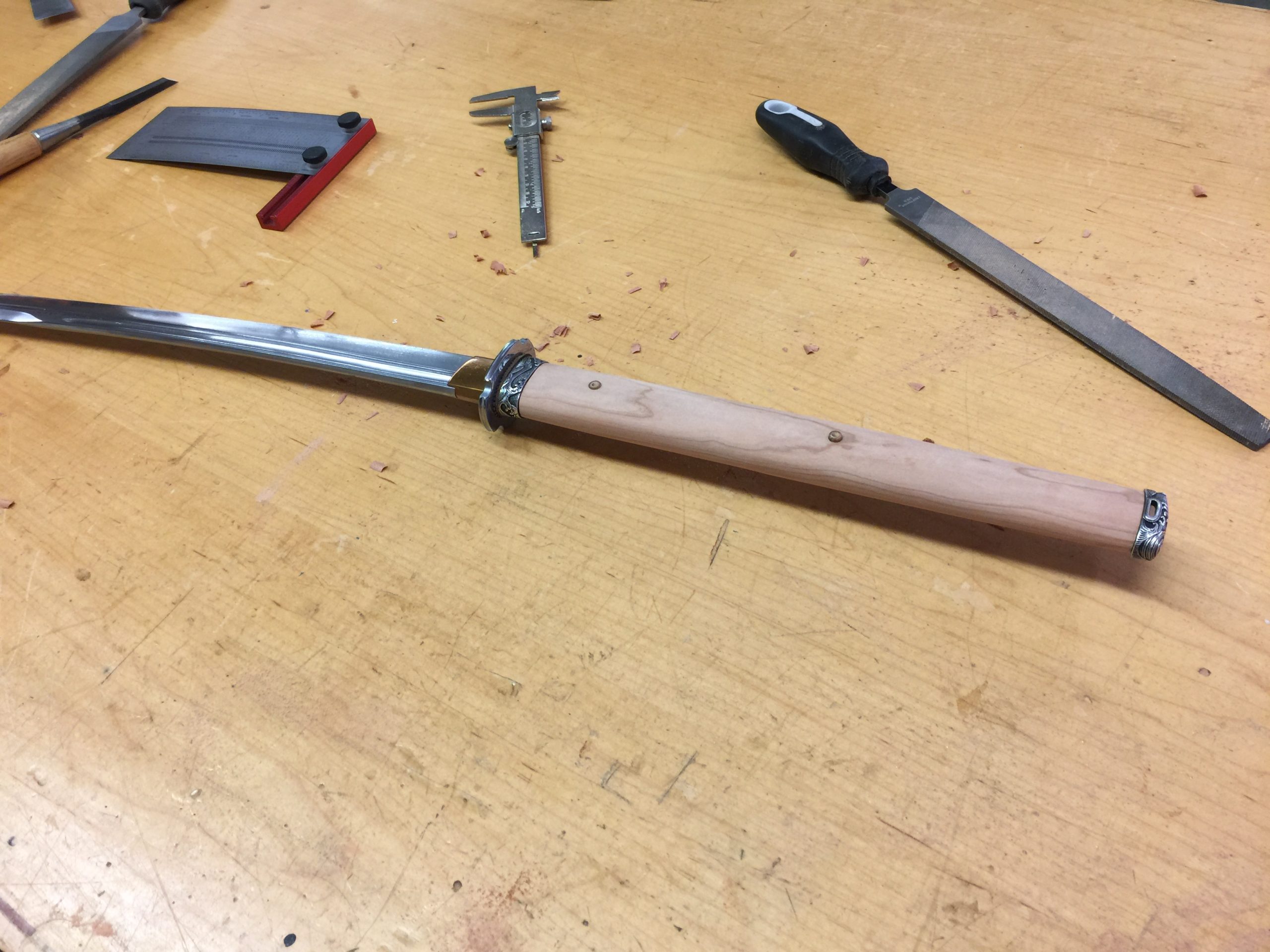 There’s always a little nervousness when the saya is first glued up. If for whatever reason it’s too tight, it is a real pain to make the inside any bigger. You literally have to tape sandpaper to your sword and slowly sand the opening larger until the fit is just right. It takes hours, if not days. Better to just get it right on the first try. This burden is only on those of us who make our saya as snug as I do. Traditionally, they are made a little loose and you don’t have to worry about this.