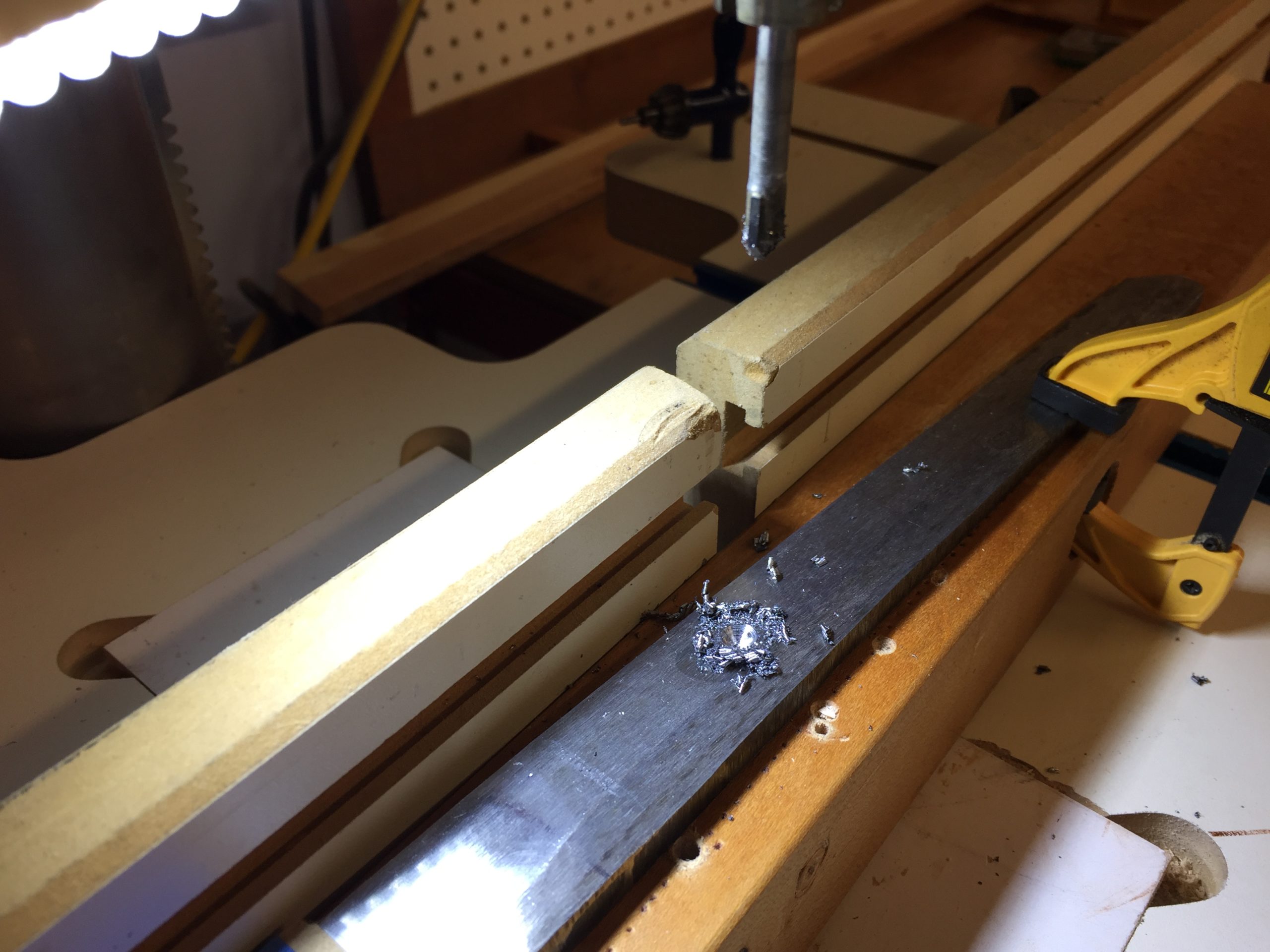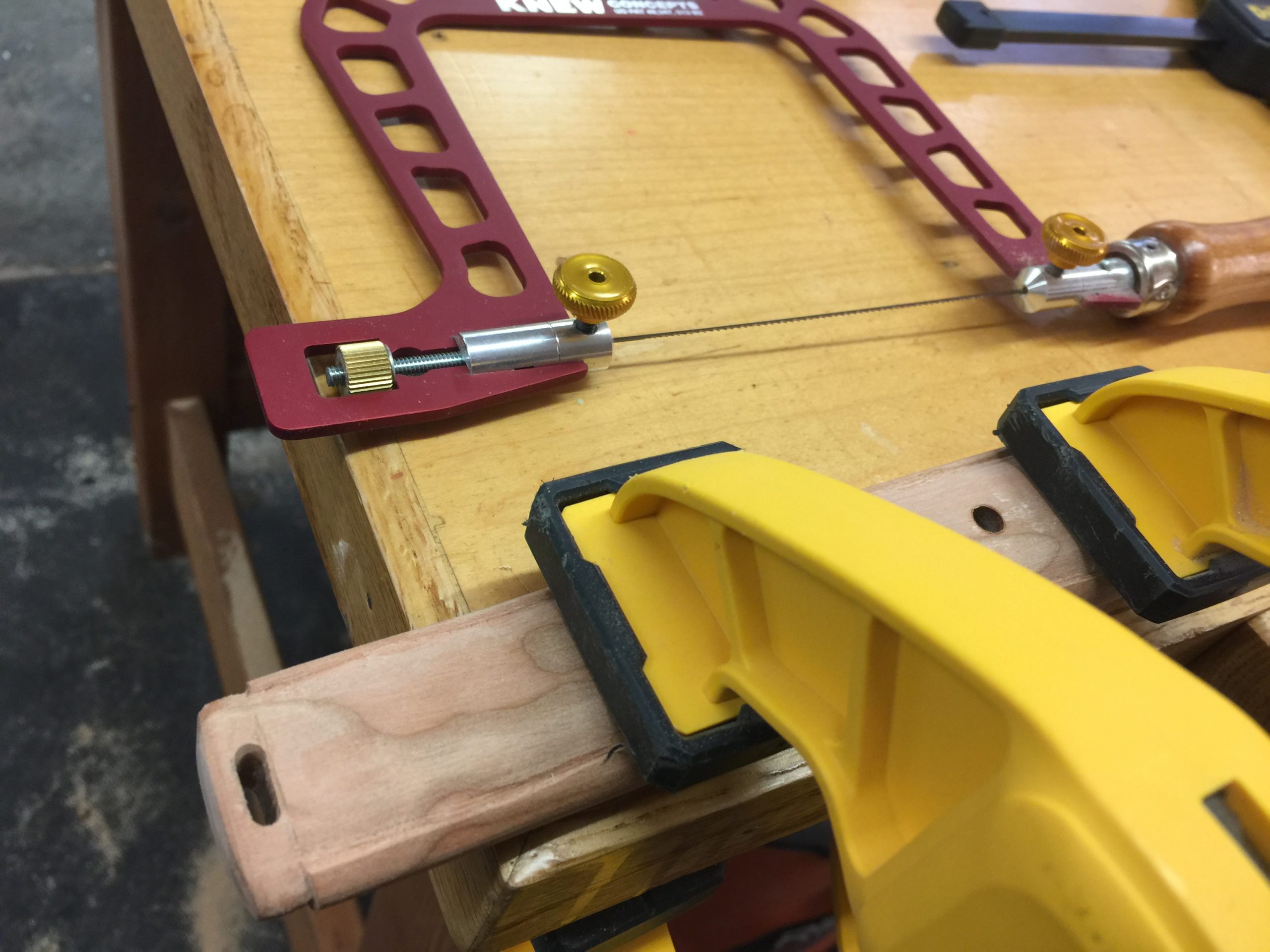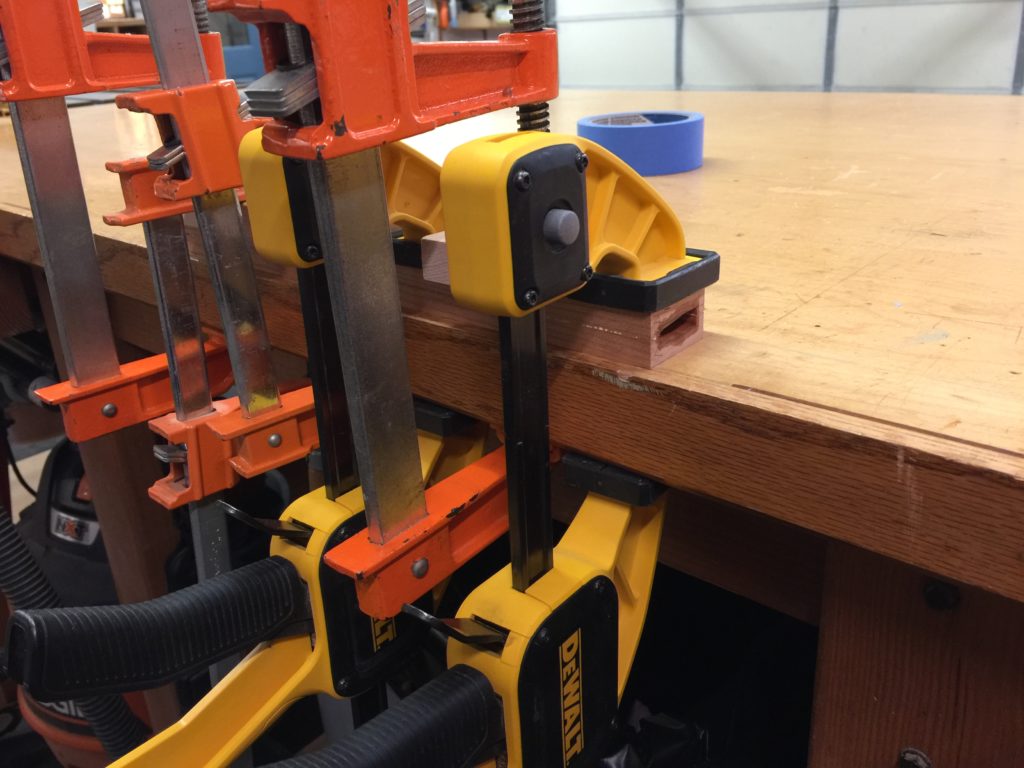 All clamps on deck for the glue up. You may notice I used popsicle sticks in the above pic. Placing them near the edge like that transfers the pressure to the outside of the saya, where the glue joint is. The middle is hollow and I don’t need the pressure there. Yeah, it’s a pain, but it makes for a good glue joint.