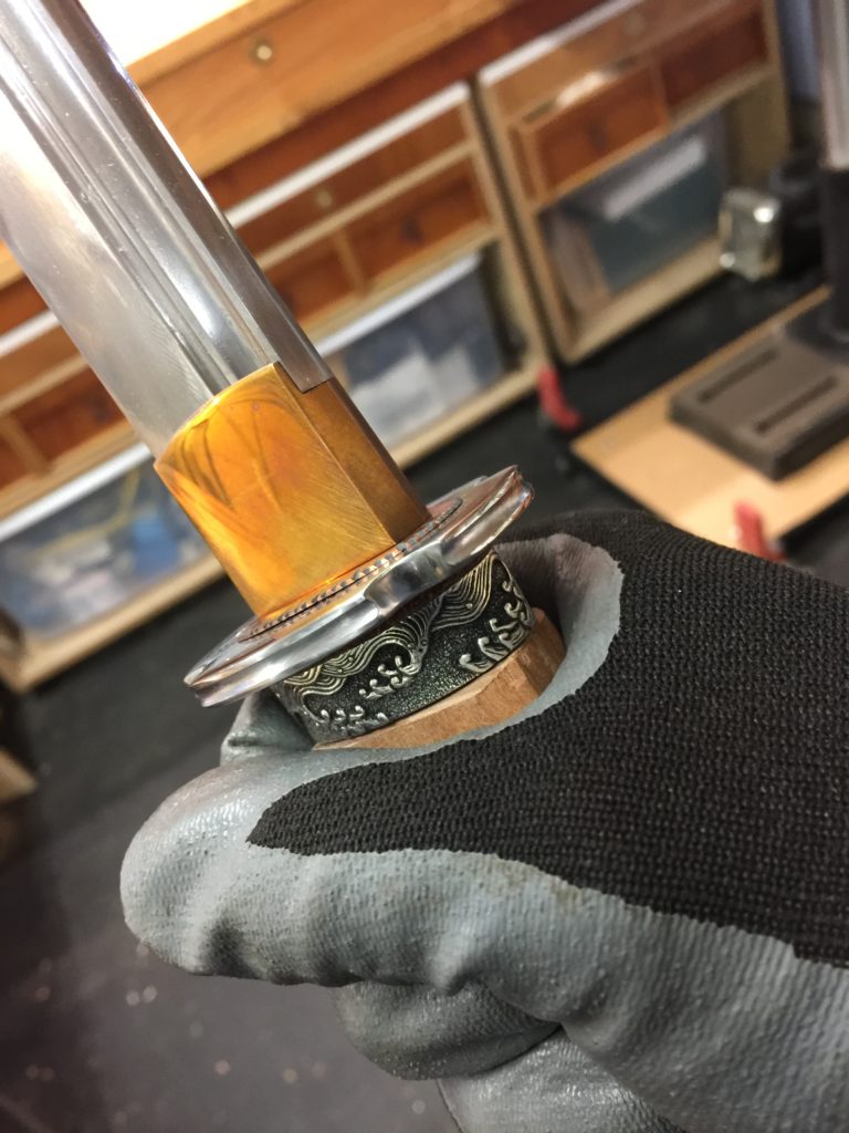 It’s a nice fit, though, and all that sanding got the saya as smooth as glass. Traditionally, saya have a carved buffalo horn around the opening there, to help prevent the blade from wearing the wood down. But this wood is hard enough to withstand training, it won’t split like softwoods will.