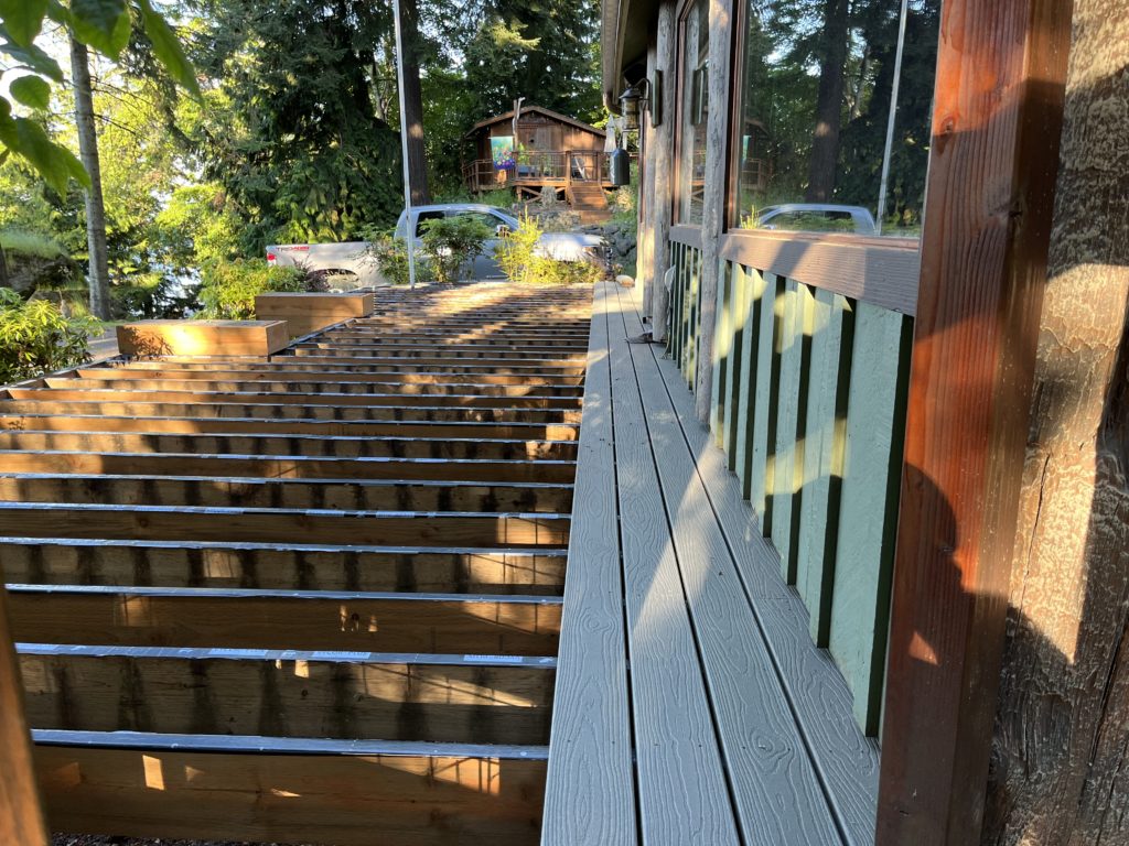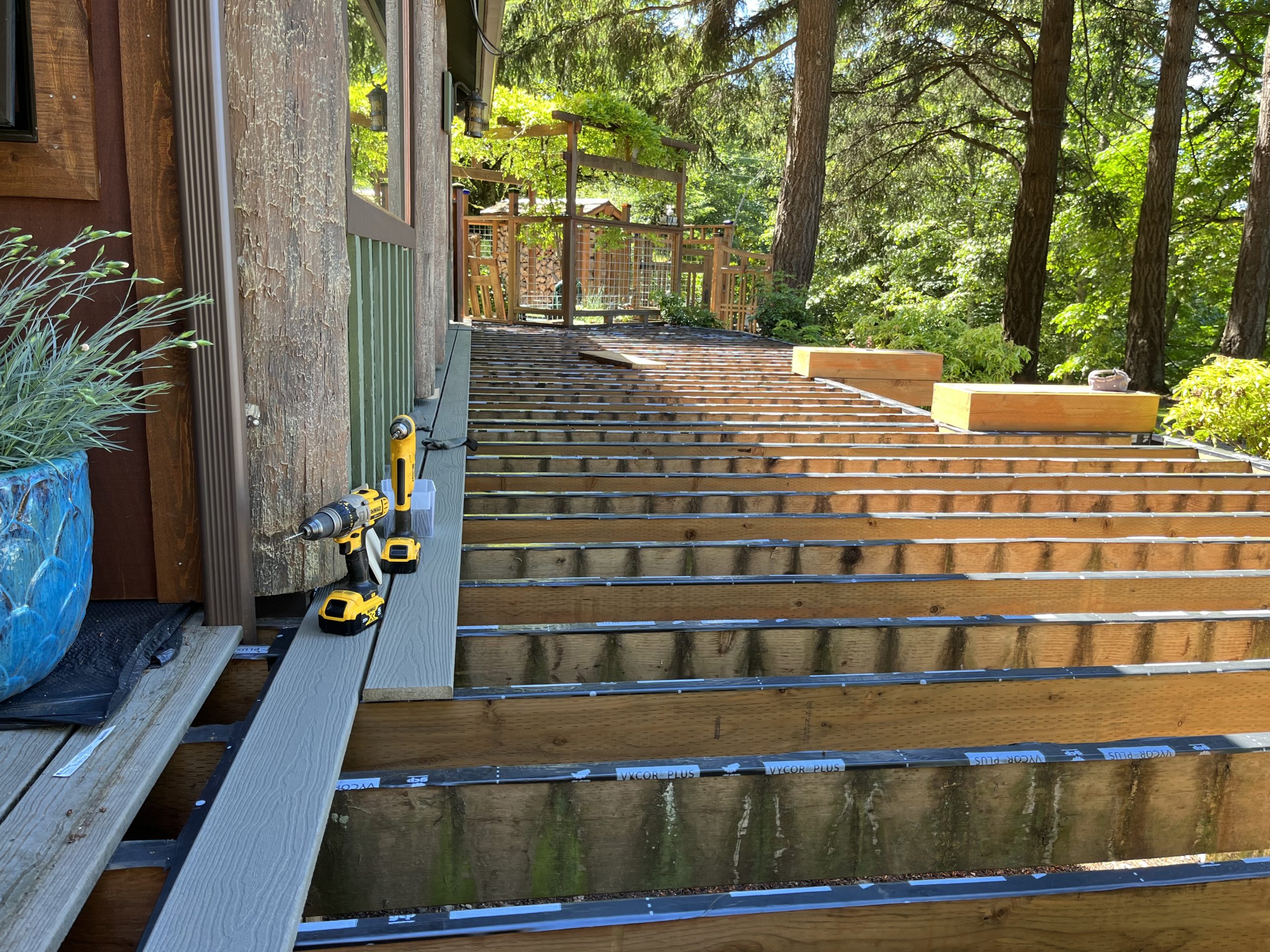 Now we’re cooking with grease! Posted on July 5, 2022 by Jef Composite deck planks are finally going down. It’s not the easy part, but finally get a little satisfaction of seeing what the finished deck may look like. That’s almost enough to walk on up there!