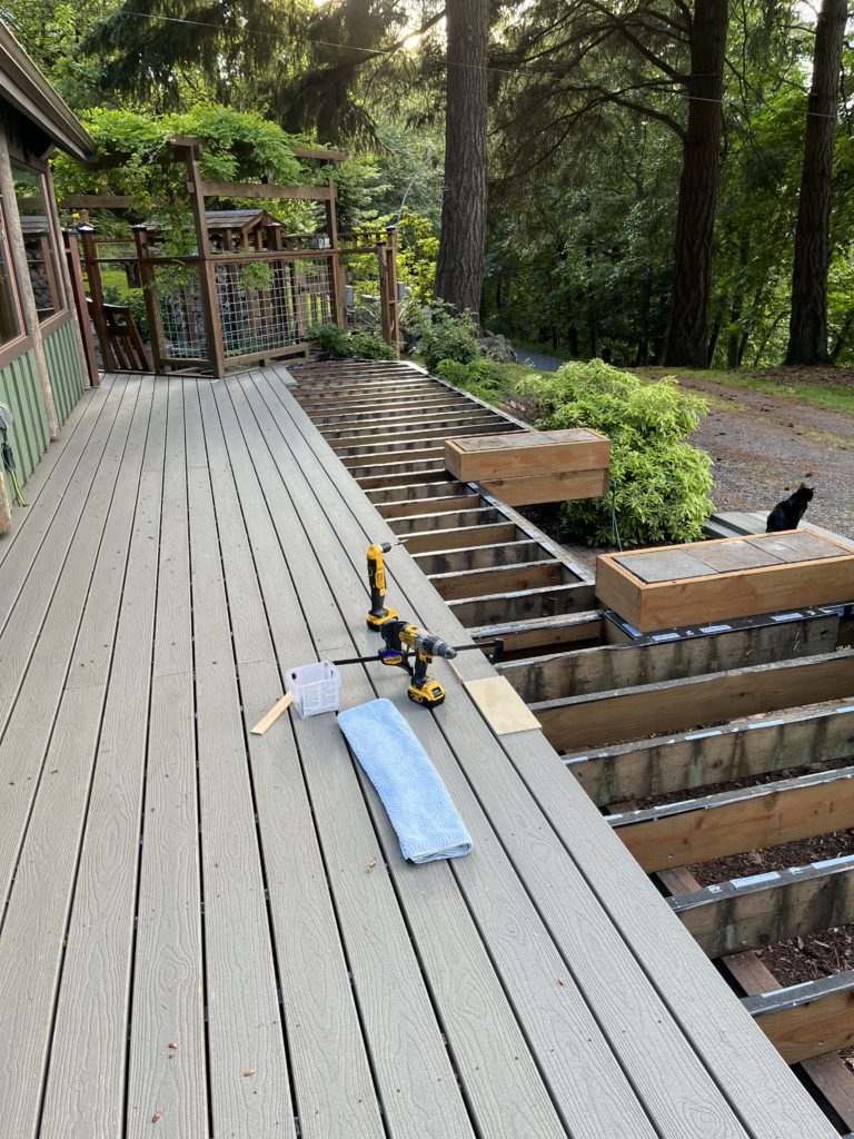 For three weekends, this was my life. A drill, a driver, a bucket of screws, a clamp, a screw template, two spacers, and a towel to kneel on. And a cat. Always a cat.