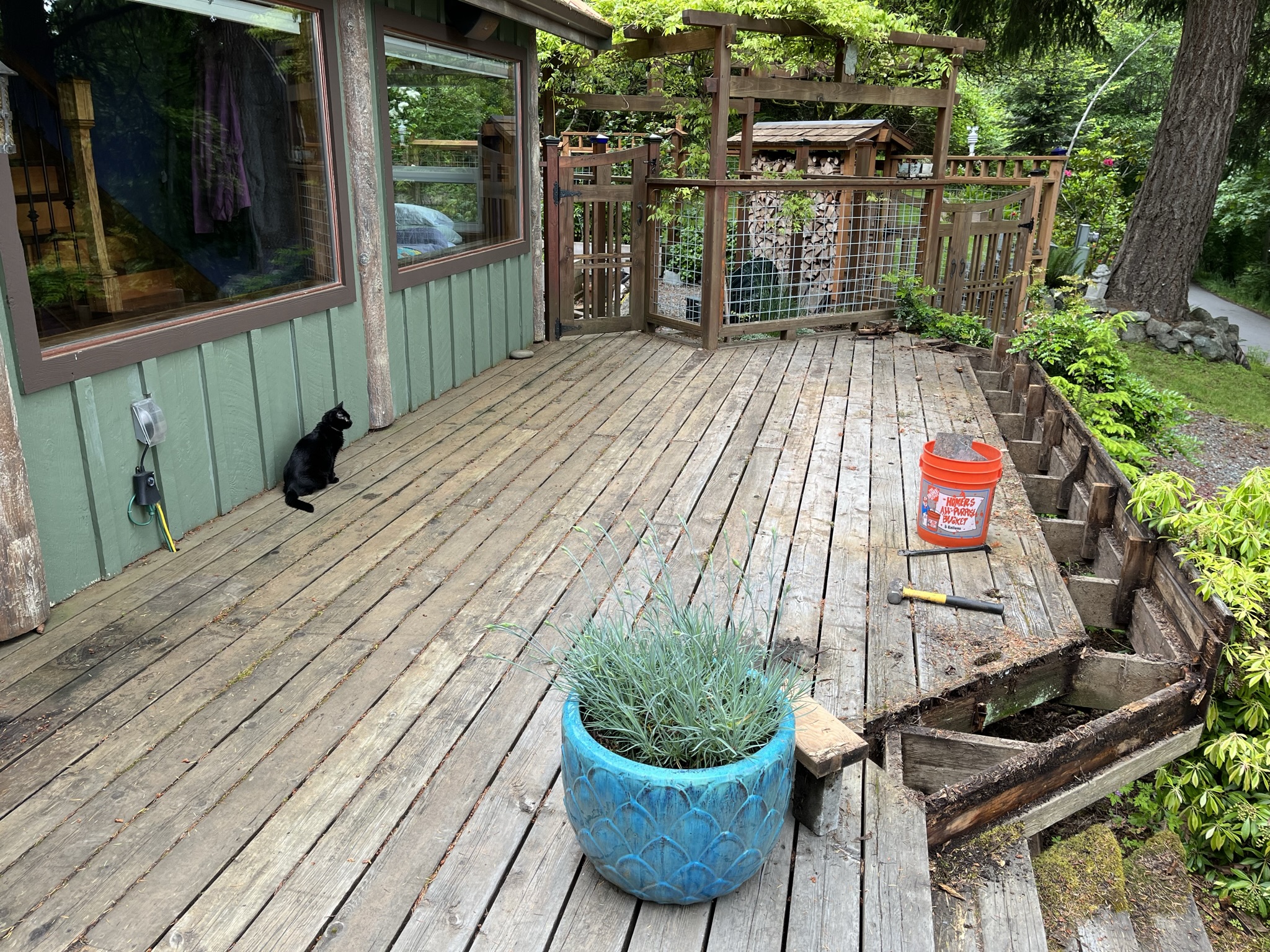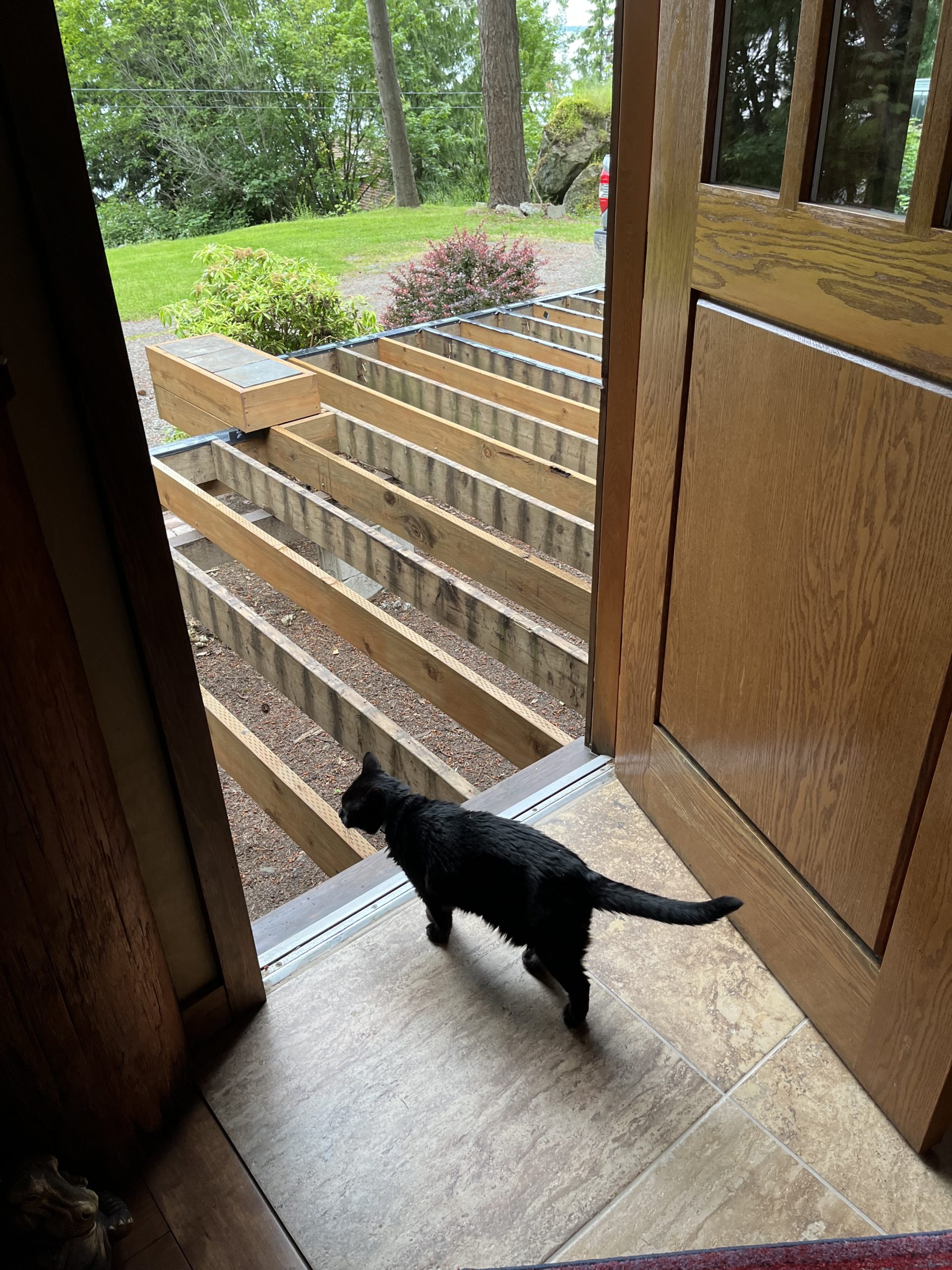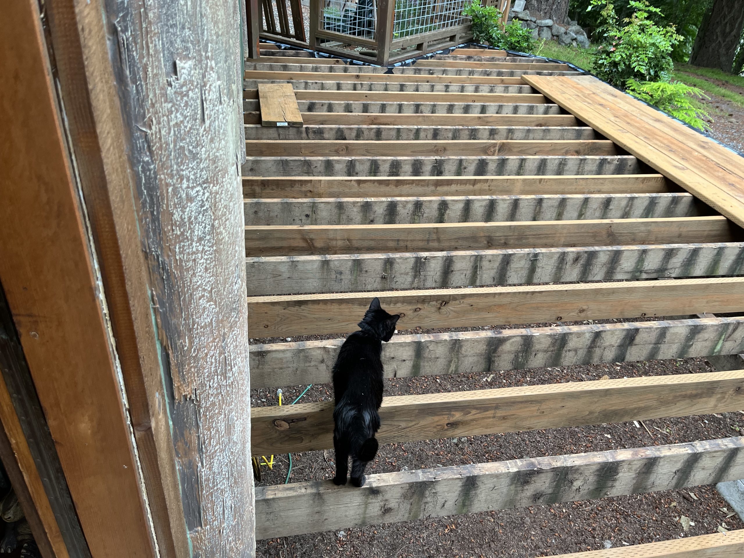 Inky was really, really good on the joists. She may be an old cat, but she has good balance. Had no compunctions about just stepping out the front door and walking out on them. She probably wonders where the deck went, though.