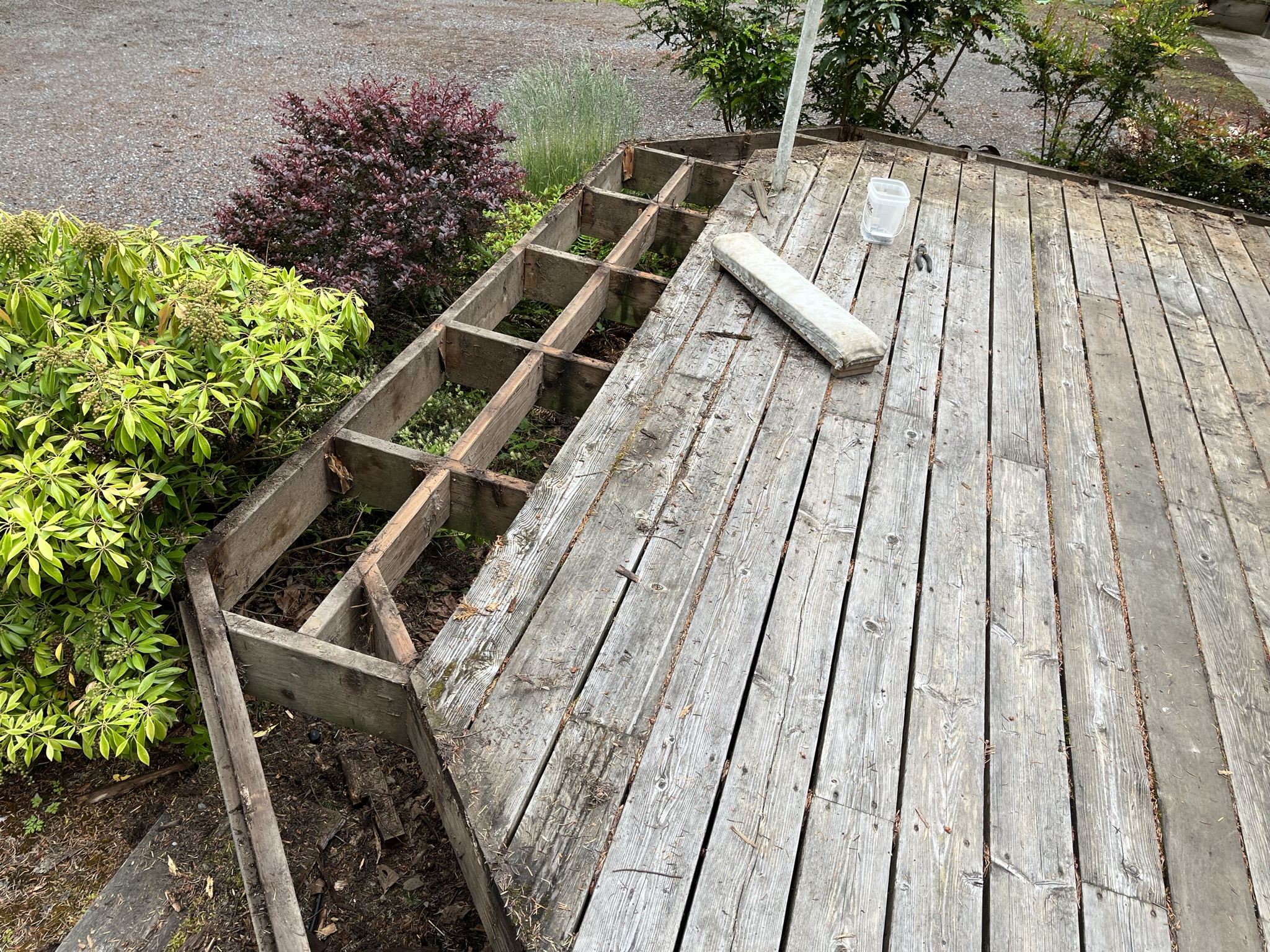 Everyone on home improvement TV shows loves demolition. It’s so fun. Just swing a sledgehammer and ha ha ha everything’s destroyed! I think it’s a pain in the ass, particularly if you’re trying to save one thing (the deck joists, for example) but want to get rid of everything around it. It’s accident prone, it’s injury prone, and you almost always uncover more things that need to be fixed than you initially thought. And those fricking hot galvanized nails are sticking out of everything.
