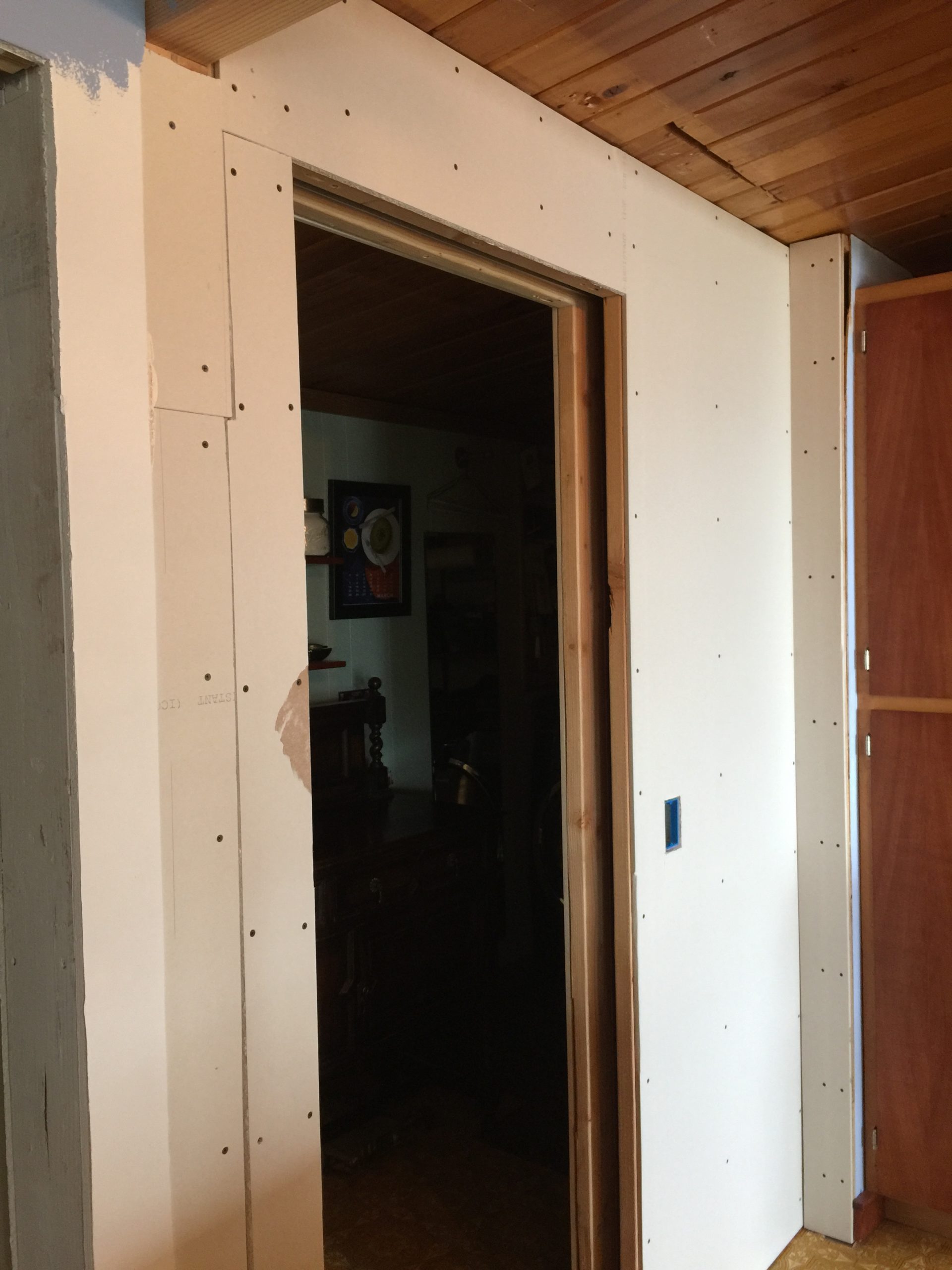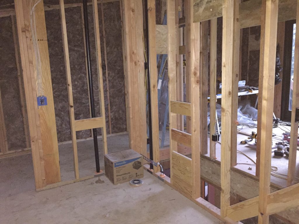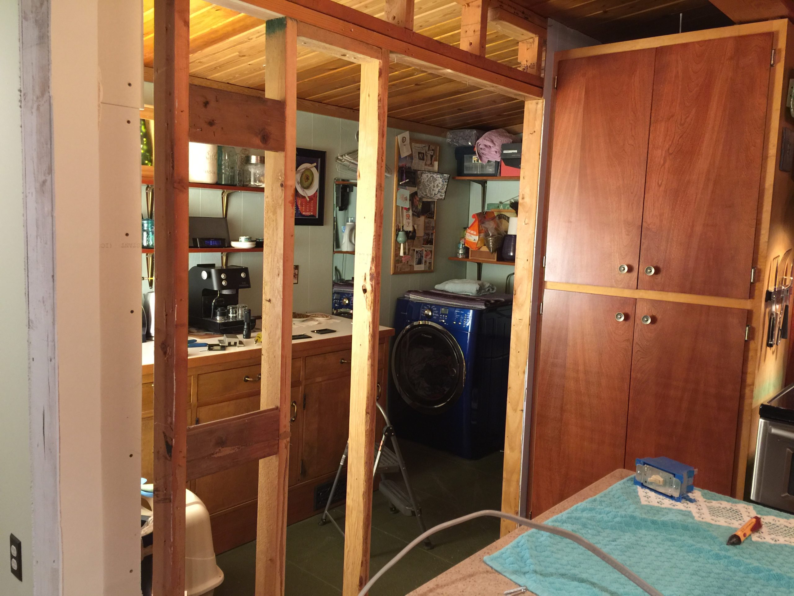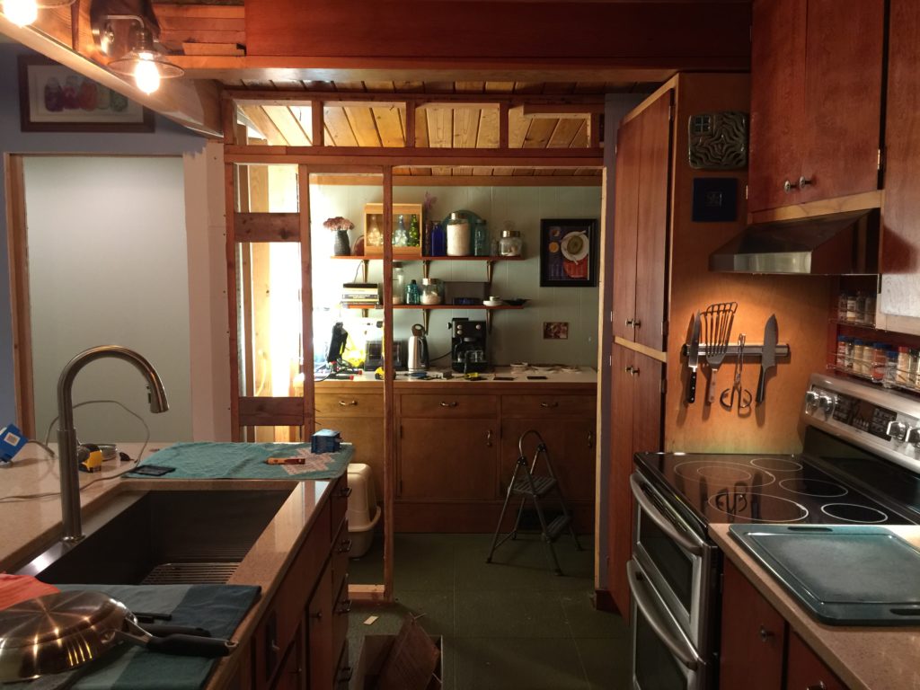 The original house had about as much closet space as a small fishing boat. There’s a tiny rectangle in the original bedroom, a small spot under the loft stairs, and a spot up in the loft that makes phone booths look spacious and that’s after I enlarged it. For the addition, we added a bedroom and a walk-in closet. A nice, big, high ceiling walk-in closet.