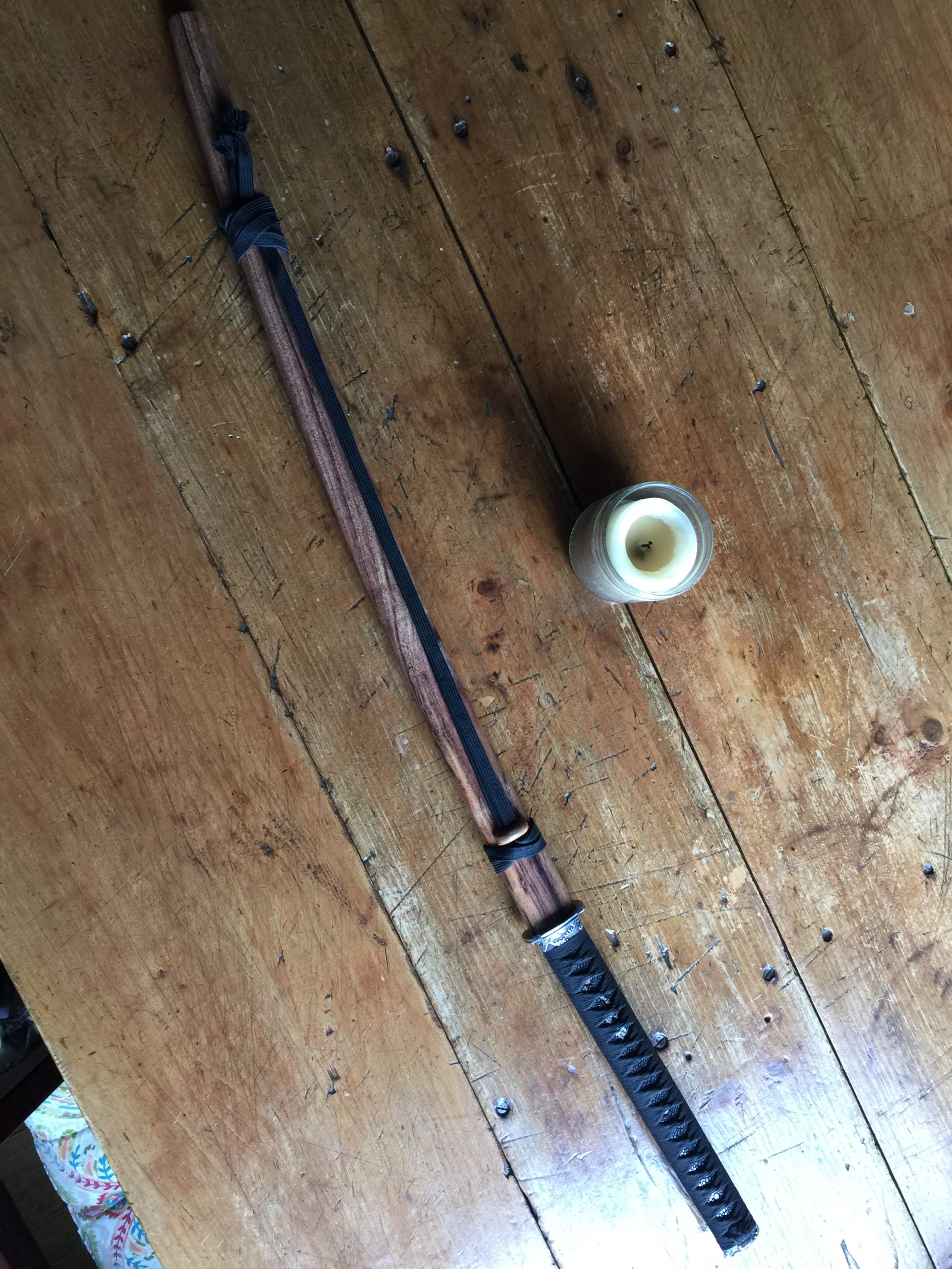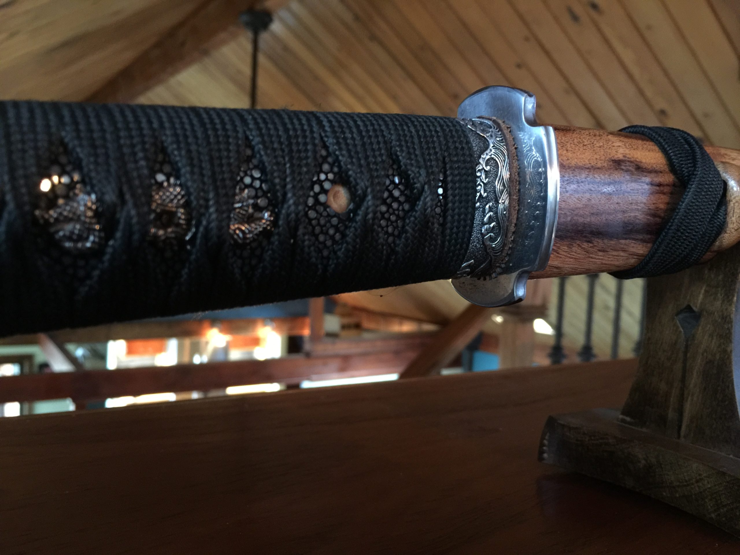 That silk cord that runs the length of the saya is called the sageo. I chose a non-traditional wrap, one that works a little better for me when practicing. If you haven’t realized by now that I don’t much care about tradition, I don’t think you’ve been paying attention.