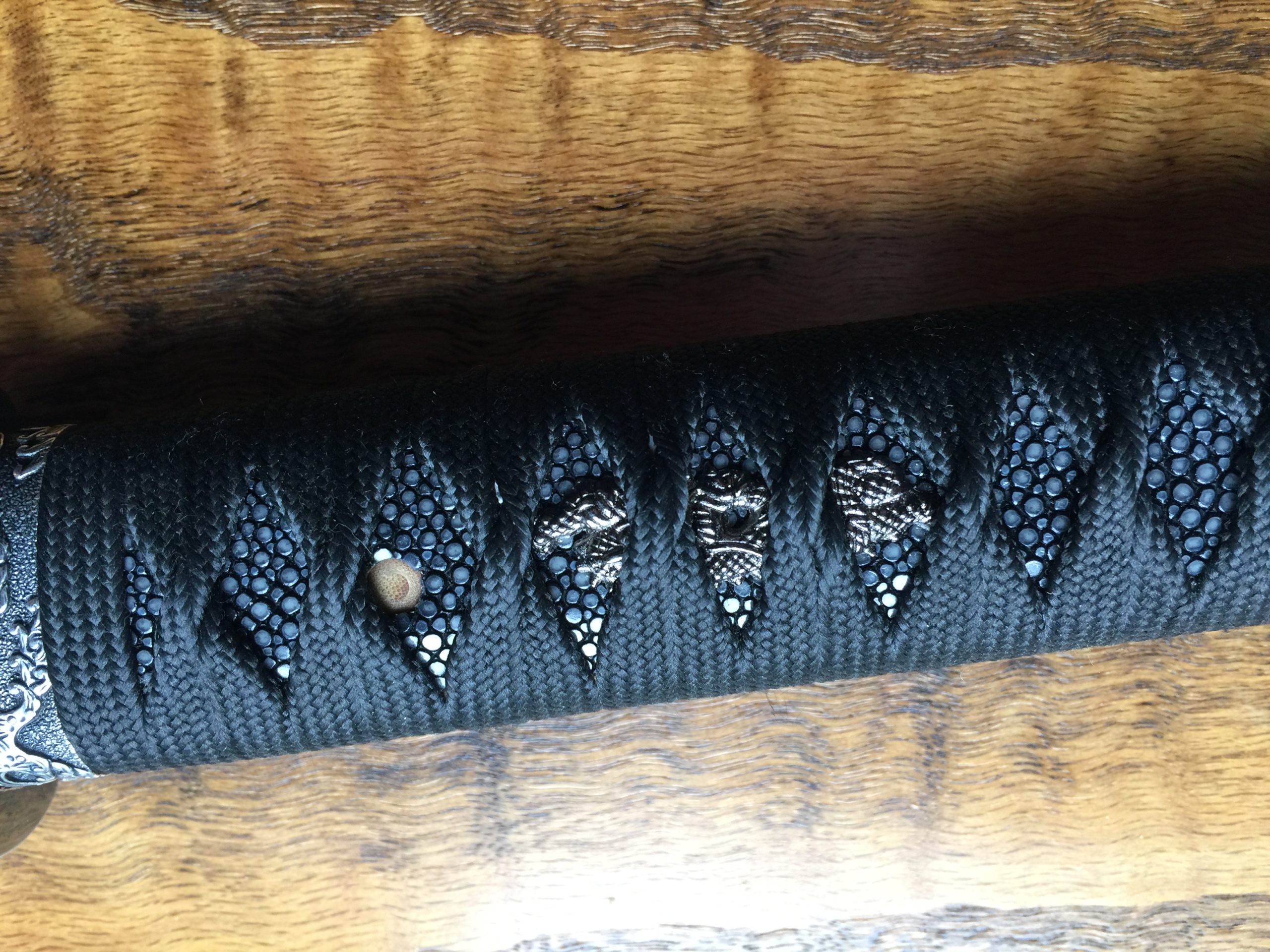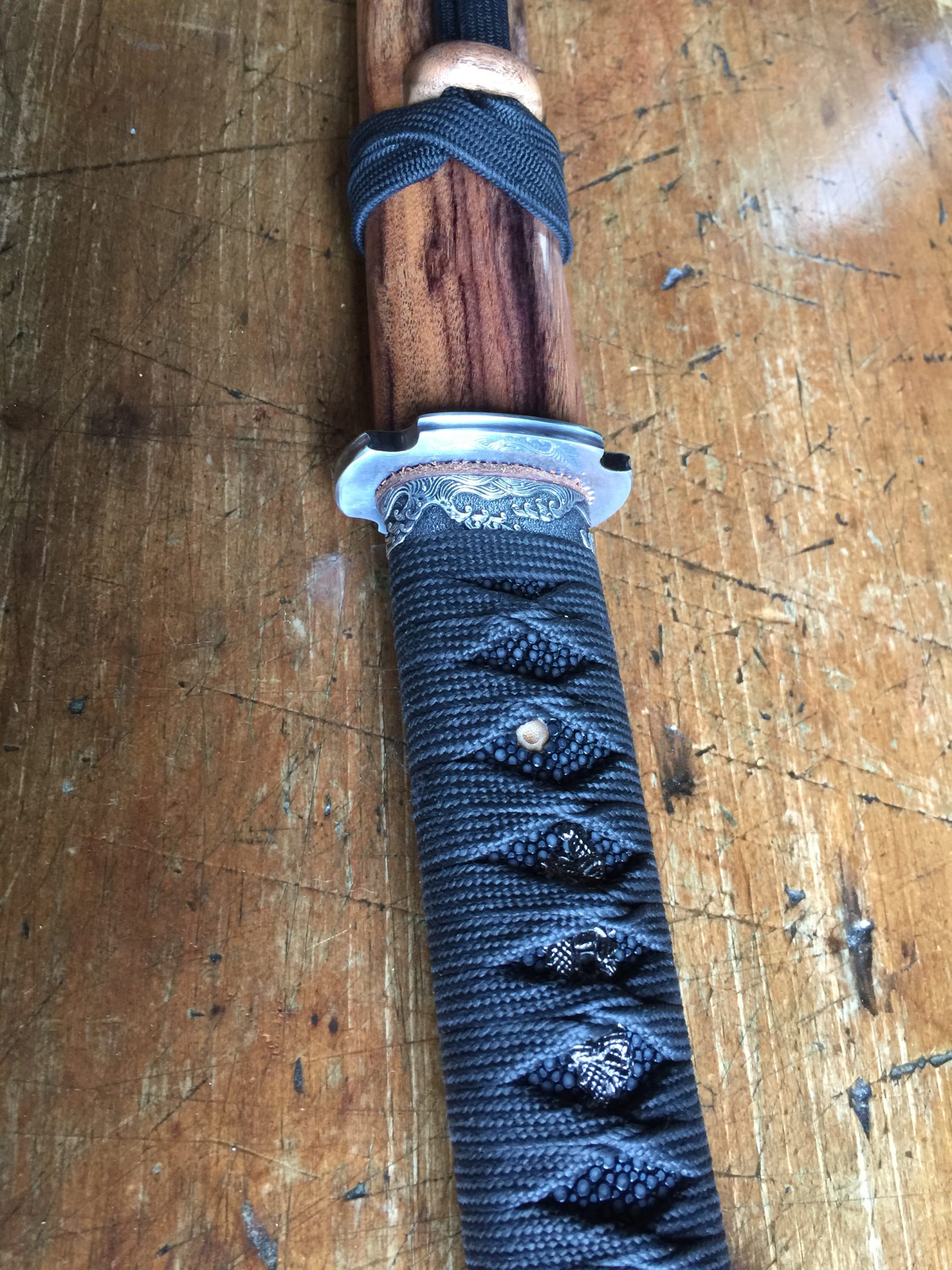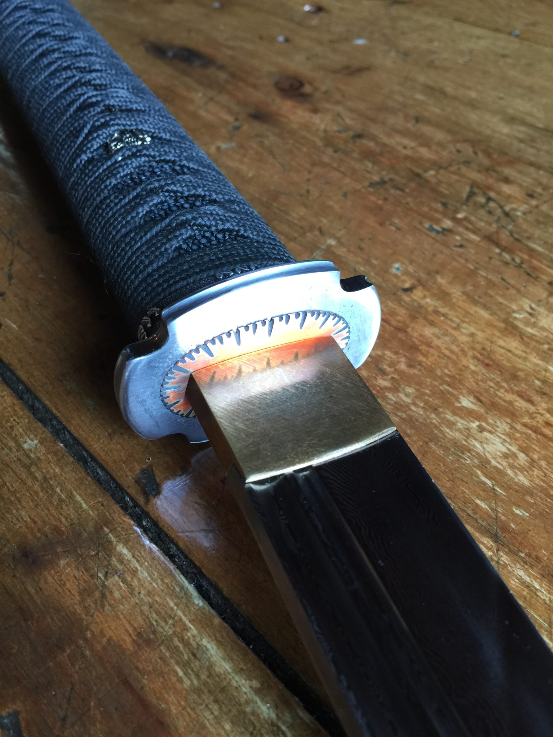 The tsuba is the hand guard that sits between the handle and the blade. It gives the hand a little protection against an opponent’s blade and also prevents your hand from slipping up the handle to become injured on your own blade. Most traditional tsuba are a little bigger than this, I like mine smaller as it keeps the blade a little lighter and has less momentum near the handle.