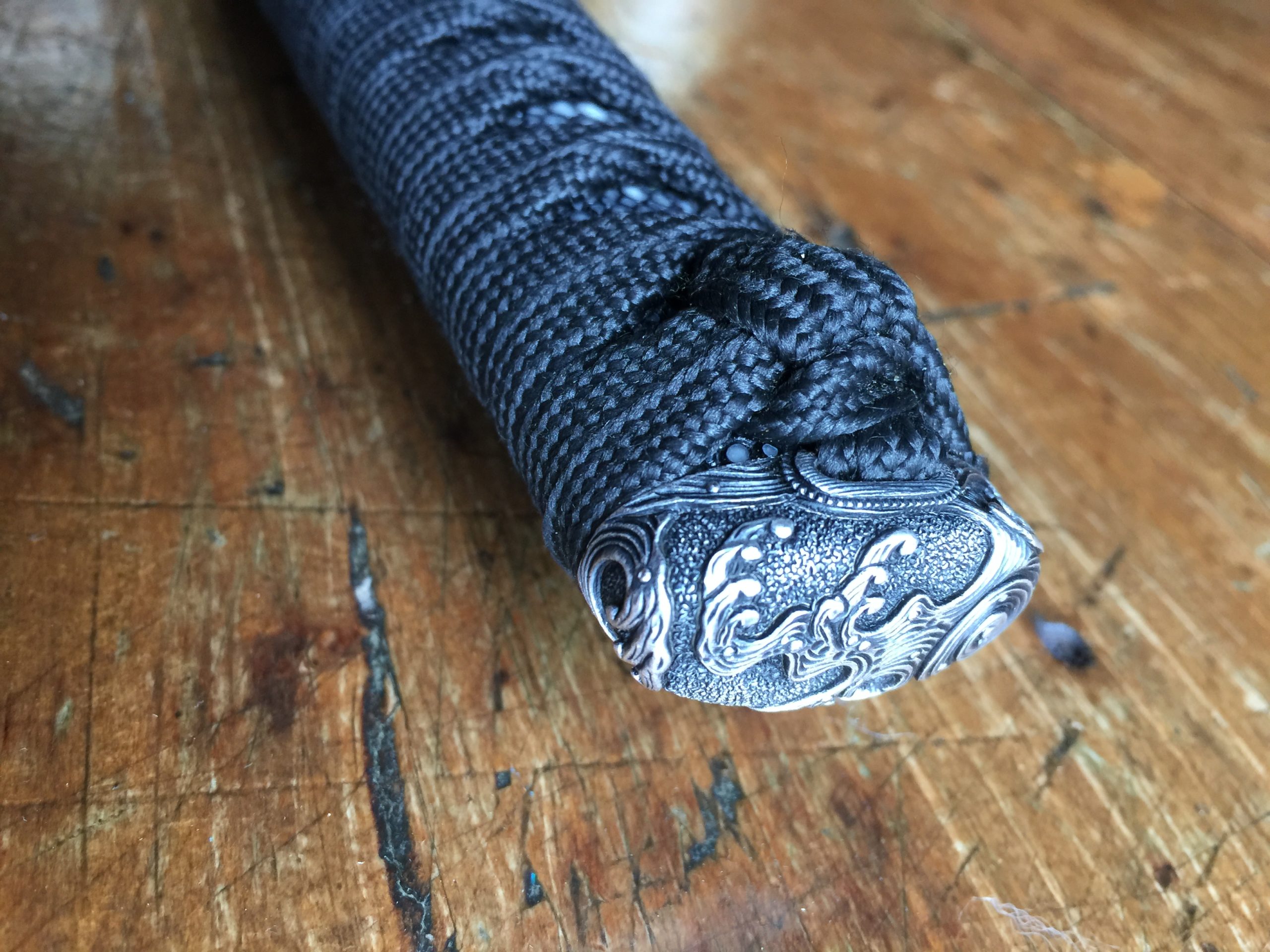 I’ve fitted the fuchi and koshirae on the tsuka, and there’s one of the menuki that gets wrapped into the handle for some more texture. They help with the grip.