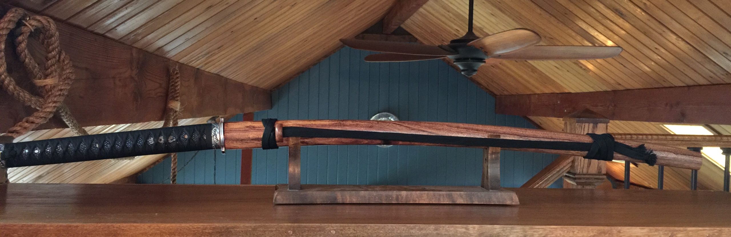 The saya is the wooden sheath the katana fits into. They are usually made out of soft wood and painted or laquered, and decorated with fantastic artistry. I’m a woodworker, not a painter. I make mine of of hardwood and let the wood grain speak for itself.
