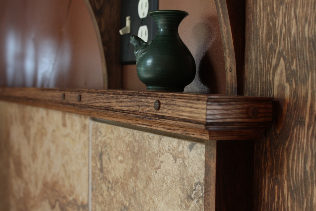 I was worried that the stove got too hot for a wooden mantle, but so far, the oak mantle has held up very well. Hasn’t even burst into flames yet, and we’ve had quite a few fires in that stove since I installed it. Those oak dowels conceal the fasteners that affix the mantle to the wall. There’s quite a few of them. That thing will never move.
