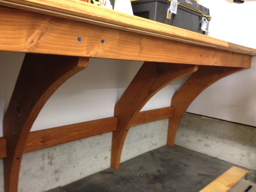 I was going to make or buy some nice brackets to affix it but I discovered it was faster to simply use lag bolts and plug the holes with dowels. Actually fits fairly sturdy that way. I think it will work nicely.