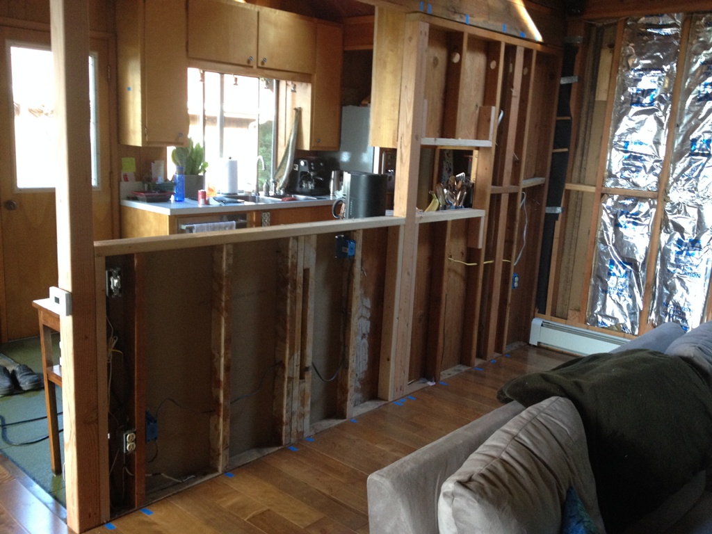 Now, we’ve always wanted to remove the wall between the kitchen and living area. We’re really sick of having to run around the corner every time someone scores a hockey goal. With the wall out of the way, we can raid the fridge and watch hockey at the same time! And, it really opens the house up, making the tiny kitchen bigger.