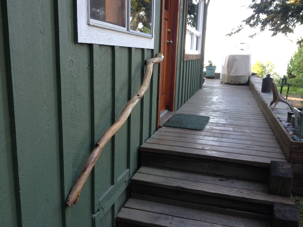 I’m not really a fan of making everything out of driftwood, but I found this piece a while back that would make Gandalf proud to use it for a wizard’s staff. It looked like it would fit well at the side door so it didn’t take me long to rip out the old handrail and affix this one to the wall.