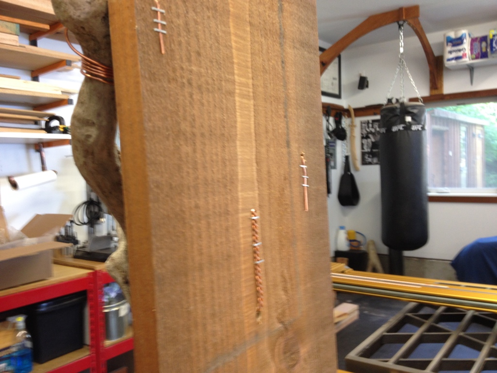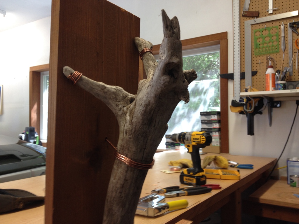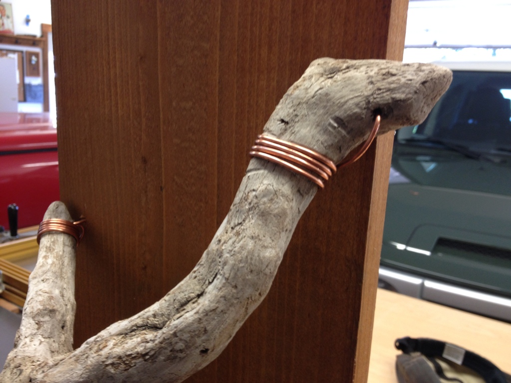 That’s where all the copper wire comes in to play. It weathers well outdoors, like driftwood, and the 12 gauge stuff is plenty strong enough to hold it in place. Just drilled through the wood in a few places to get it started and wrapped it tightly around the ends.