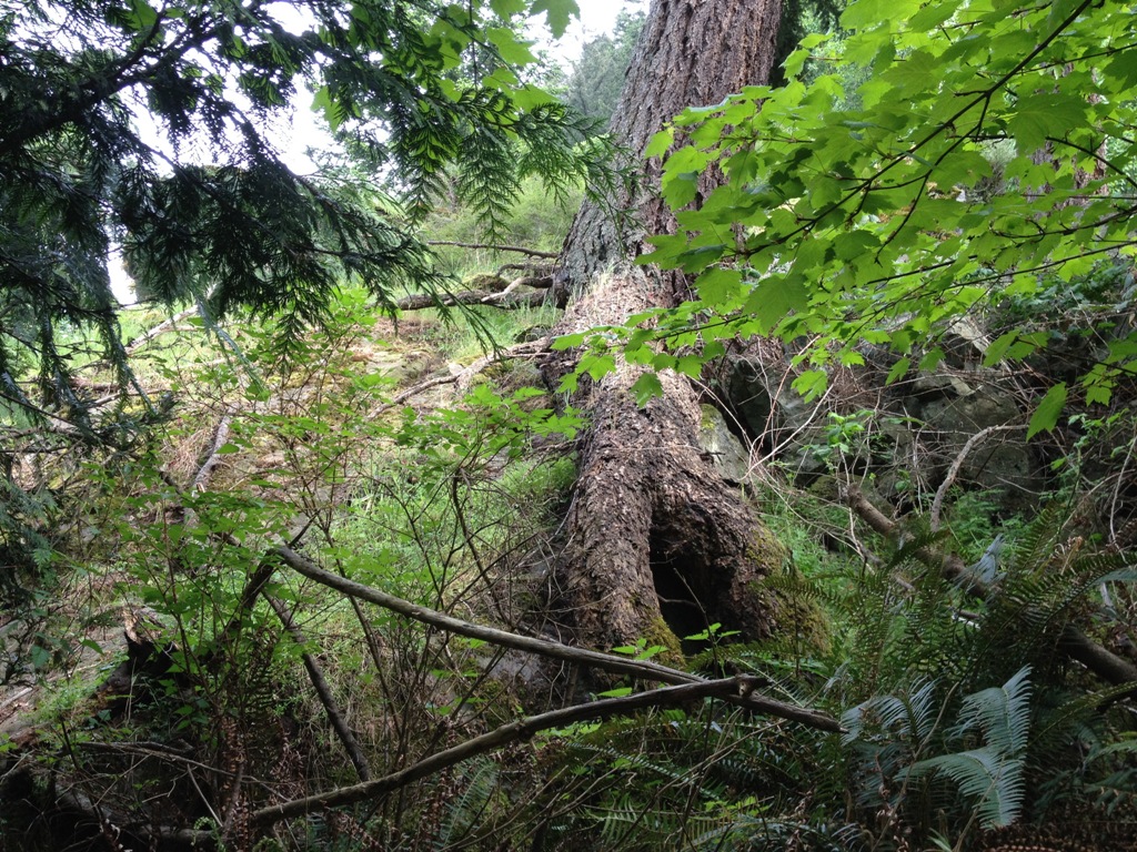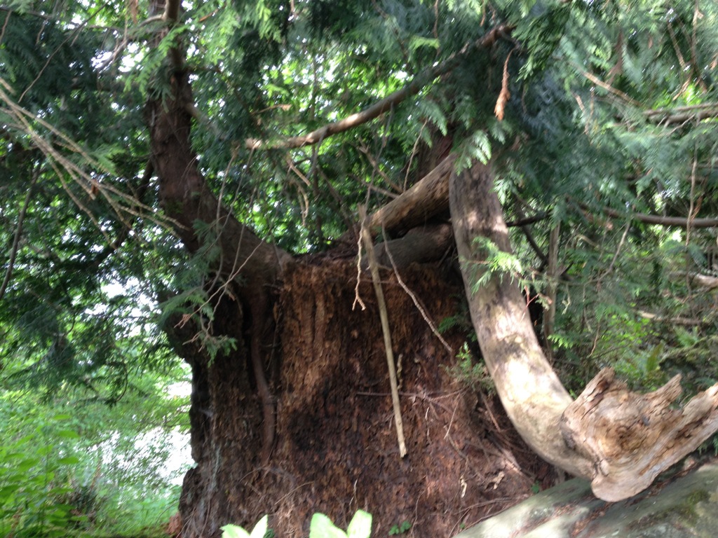 This is an old, decomposed tree stump that is so big that two trees are growing out of it. Read that again. Two trees make root in this tree stump. And not just little saplings, they’re 40′ cedars. Growing out of a tree stump.