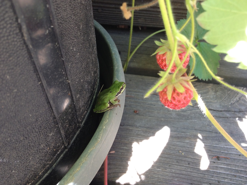 Frog in our strawberry plant. I think he wants to eat a strawberry, but they are bigger than he is so it poses a logistical issue.