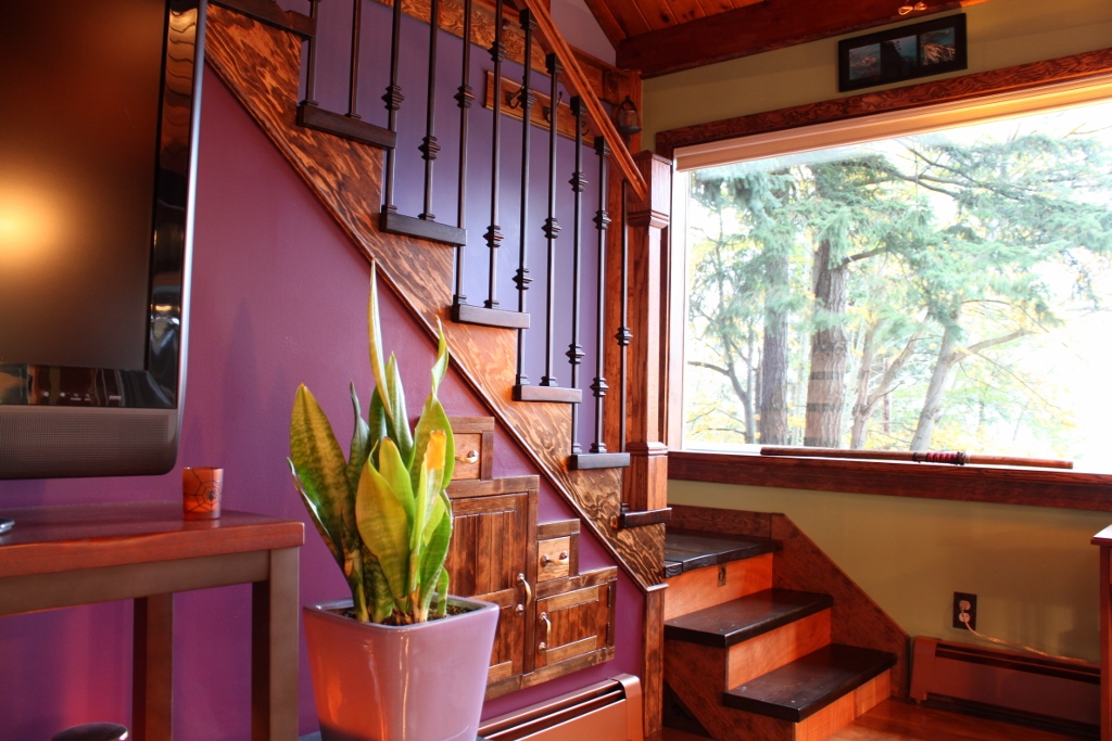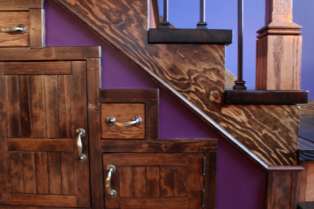 The risers have a nice, coppery color to them. That’s T-111 paneling, so it’s rough cut cedar plywood, sanded a little smooth and drowned in about a pint of spar urethane. It still retains some of its rough texture, yet is smooth enough to be cleaned by a damp cloth if necessary, and hard enough to withstand scuffs and scratches.