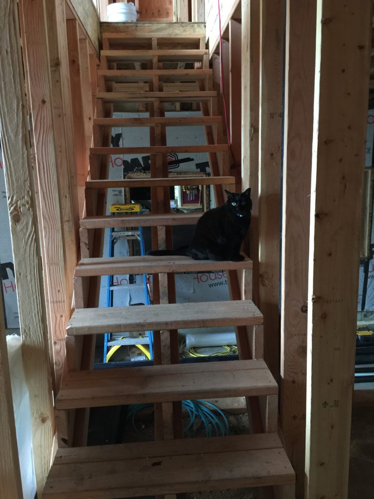 The wall stringers are in, and magically they fit without much of a fuss (thanks to all that cardboard). They serve useful purposes: protecting the drywall from being kicked in the middle of the night, containing coffee spills and tufts of cat fur, hiding thermostat wires, and keeping the slinkies in line while they roll down stairs, alone or in pairs.