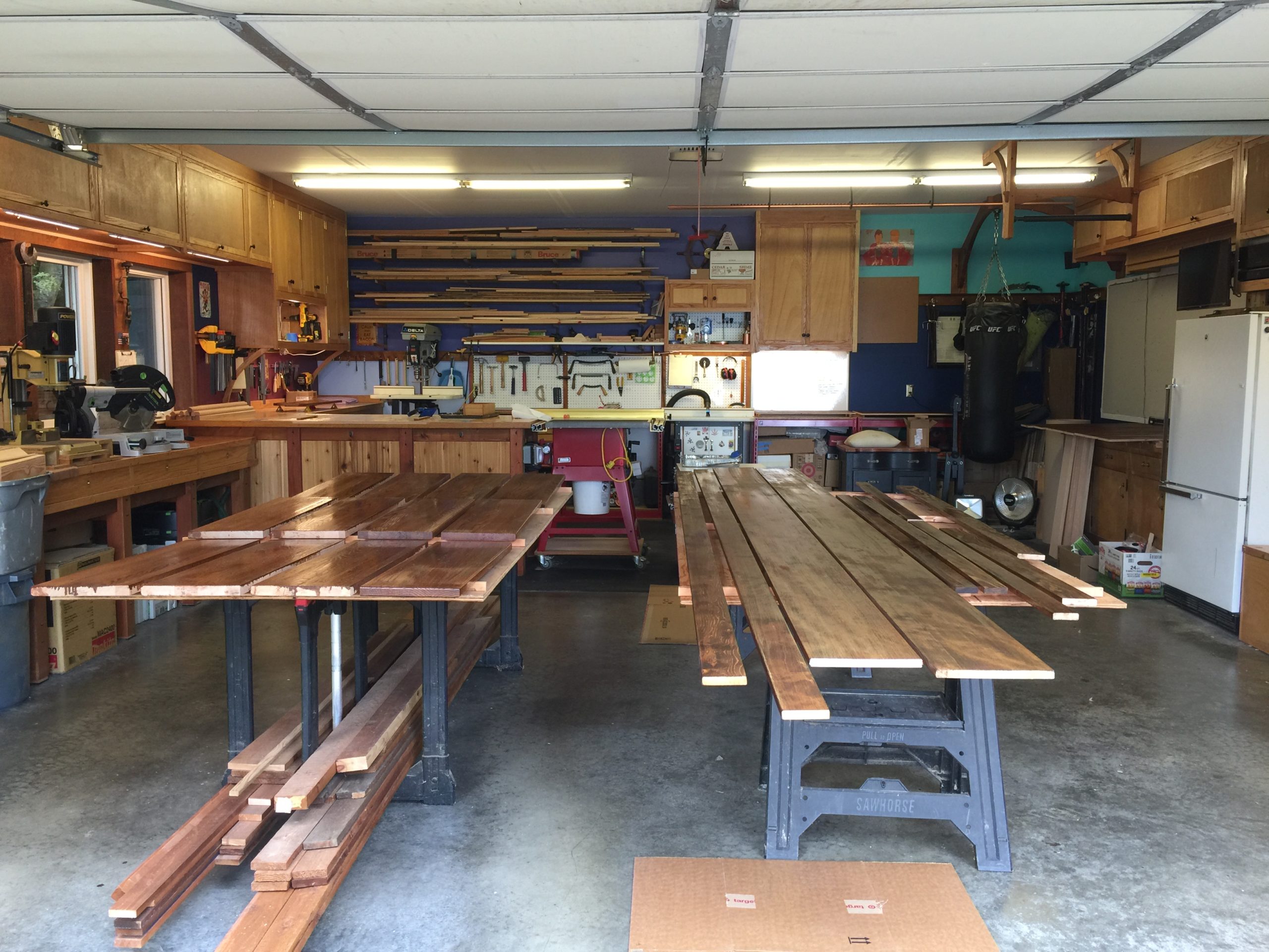 This is everything I’ll need to do the stairs: stair treads, risers, runners and trim pieces. Everything is laid out and properly slathered with polyurethane. Those 1×12 boards go up and down either side of the stairs and are a bit of a challenge as they need to fit in a snug space and they’re 13 feet long. Big and unwieldy and they need to be cut to length and be accurate within around 1/8 of an inch. This will be a magic trick if I can pull it off.