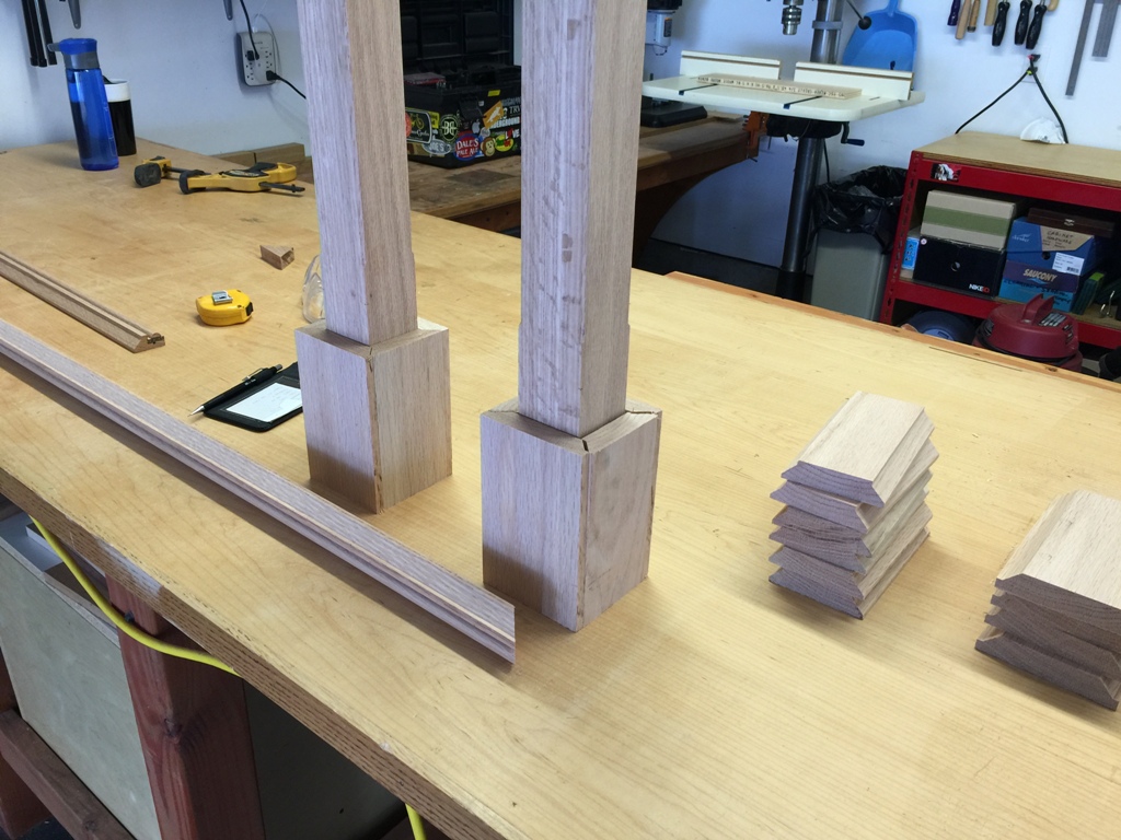 The only stock I had available was all milled to 3/4, so I had to join a bunch together to make that middle part. See, I don’t even know what post parts are called. Whatever that middle part is called, that’s what I made. Oh, and I made some strips on the router, and they’ll go around the, um, the other post parts. Whatever they’re called.