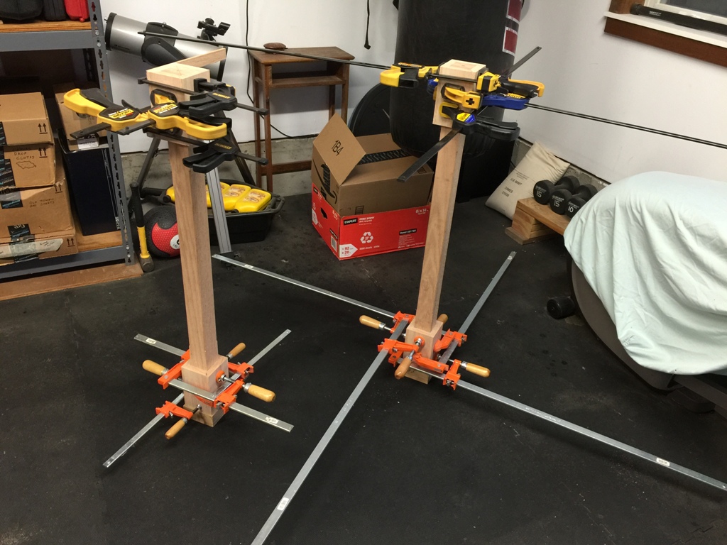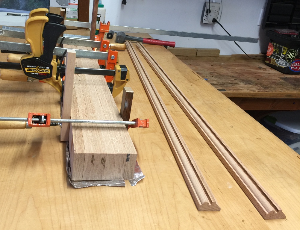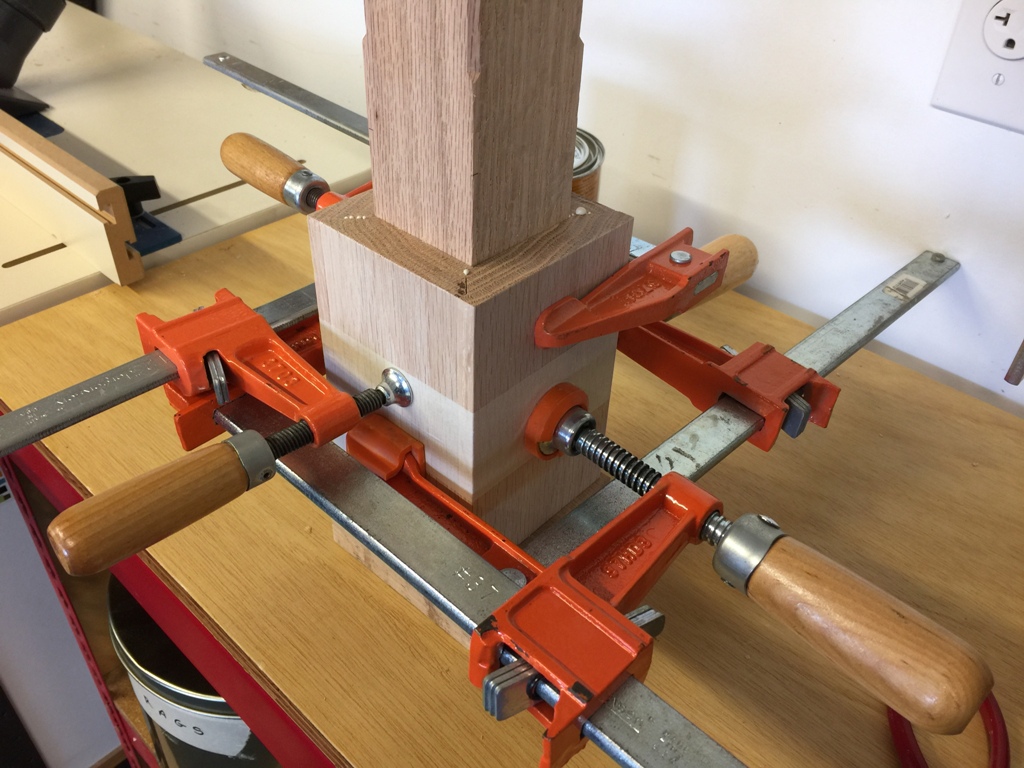 Just because there were a lot of pieces being glued, I used tape to hold them all together, then clamped them. And then I remembered what happened the last time I left clamps on tape overnight (the glue from the tape pressed into the wood and made areas that didn’t take stain very well) so I had to remove all the clamps and take off the tape and put the clamps back on. Live and learn, and forget, and re-learn.