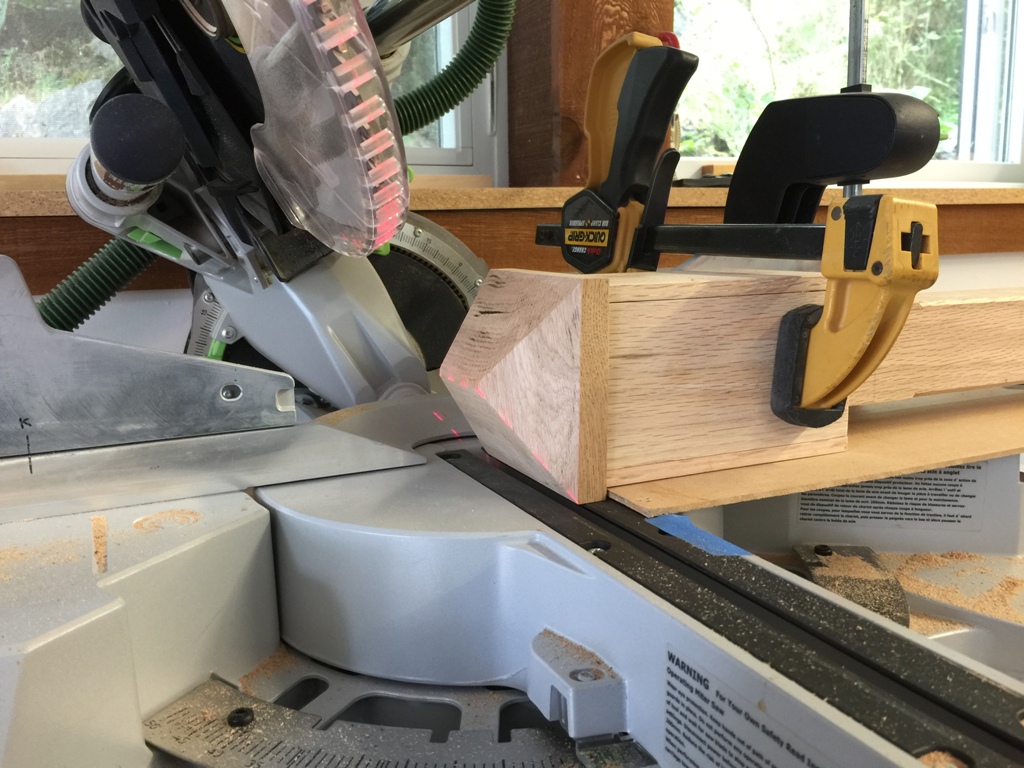 The top part thing (maybe it’s called the cap?) was a little more difficult than I wanted it to be. Took a few tries to get it correct. Plus, that wood’s just a bit too big for the saw, and there were cuts where the saw couldn’t cut all the way through. The end result looks good, though.