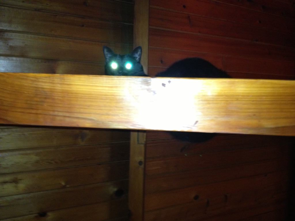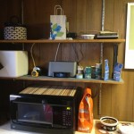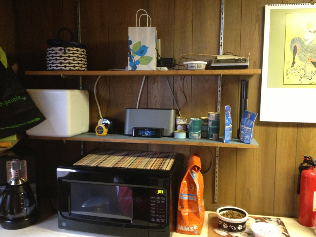This tiny little 5 x 10 room has a lot of functions. In addition to laundry, it’s got to have a place for a cat litter box, the microwave and coffee pot, cat food, and quite a bit of miscellaneous utility storage. It needs to have a hanging wardrobe of sorts, a place to hang clothes fresh out of the dryer, have hooks for mops and brooms and crossbows and whatever else needs to be hung up.