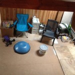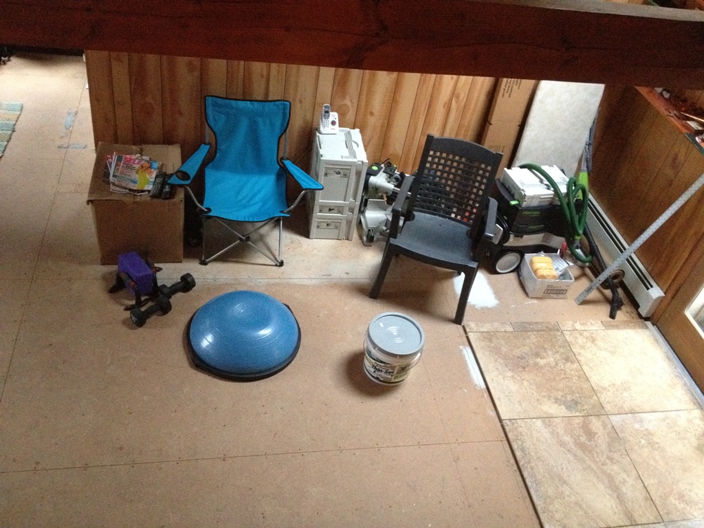 The blue chair stinks, so I’m told. I can’t smell anything. That bucket of premixed mortar makes a great footrest, though.