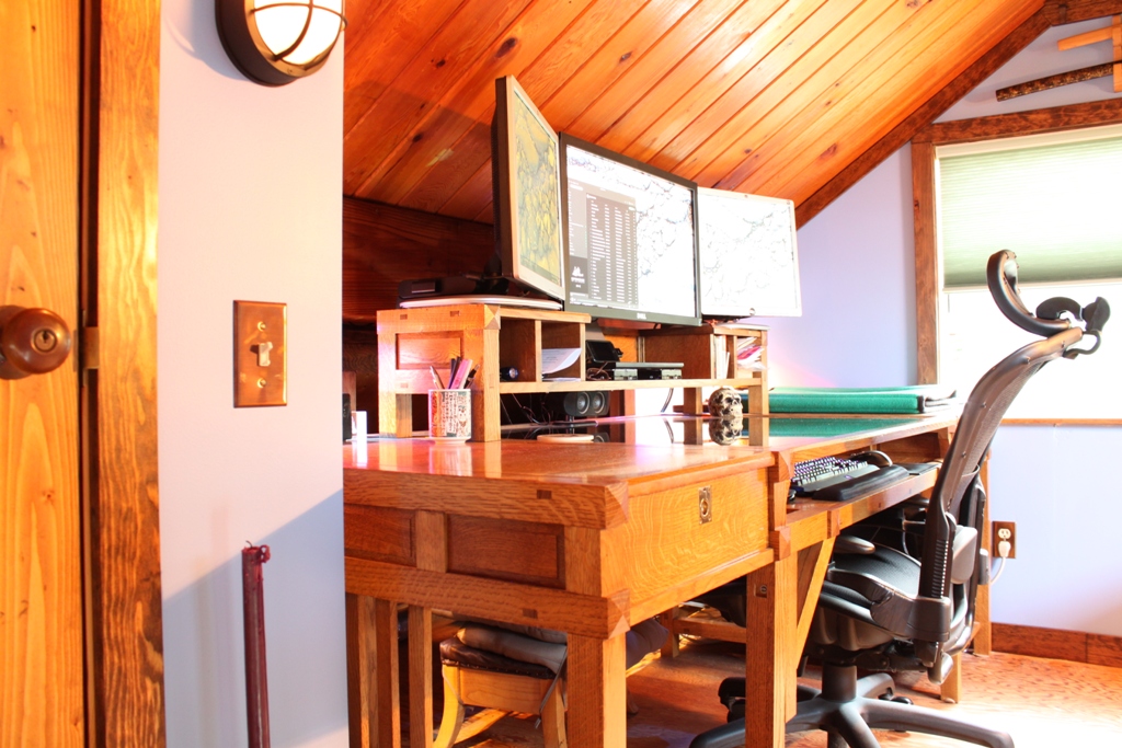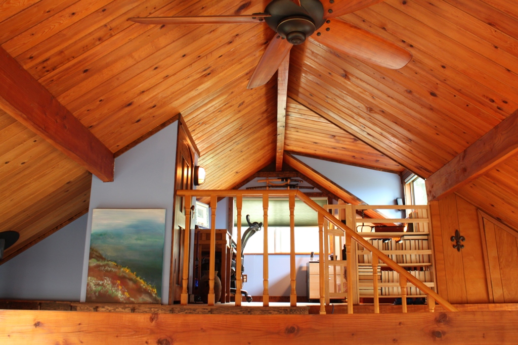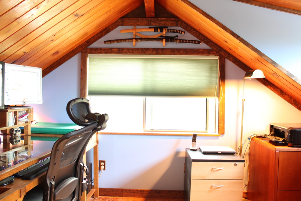 With the desk in a nook, it’s really opened up some space in the loft. It’s not a big room at all and the A frame limits moving around very much. In small houses it’s really important to make the best use of your space. Or, be very small. In fact, I bet this house is considered fairly large by cats, squirrels and mice.