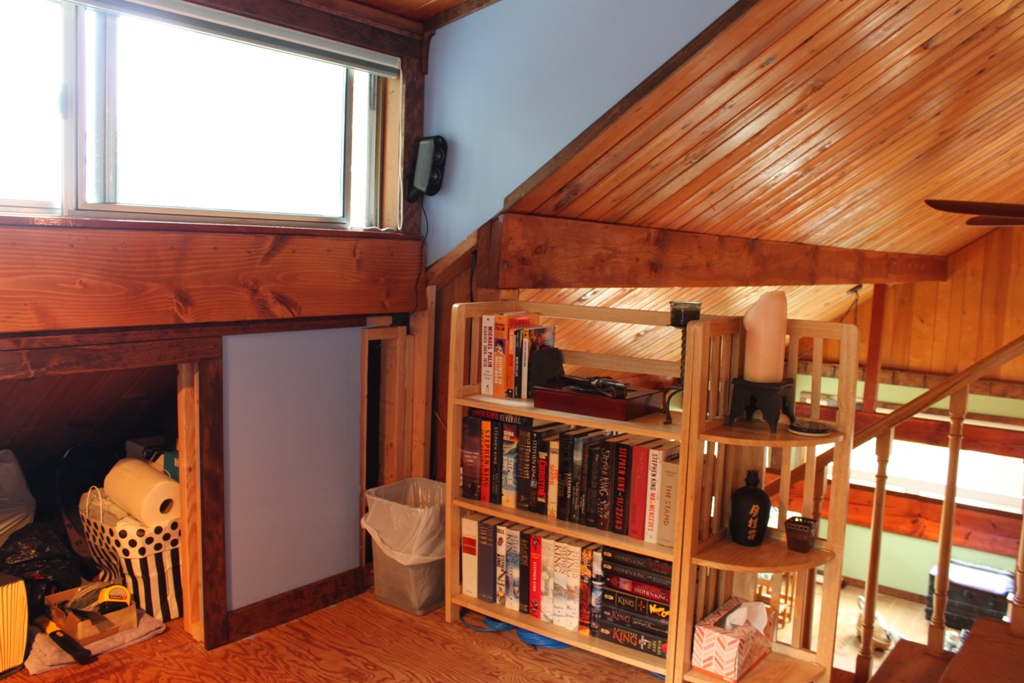There’s a bit of an unfinished corner up there. And speaking of doors, I need to make some pocket doors for those storage area. And see where that cheap bookshelf is? I’m going to put a nice built-in bookshelf in its place, a bit bigger and with some better storage spaces.