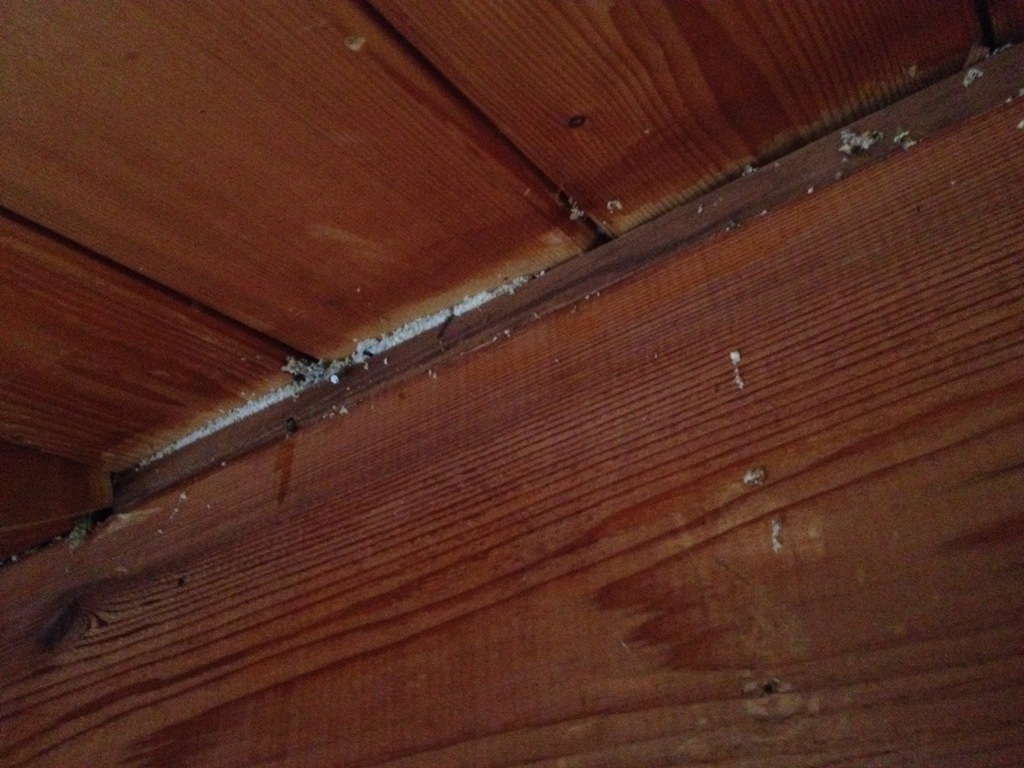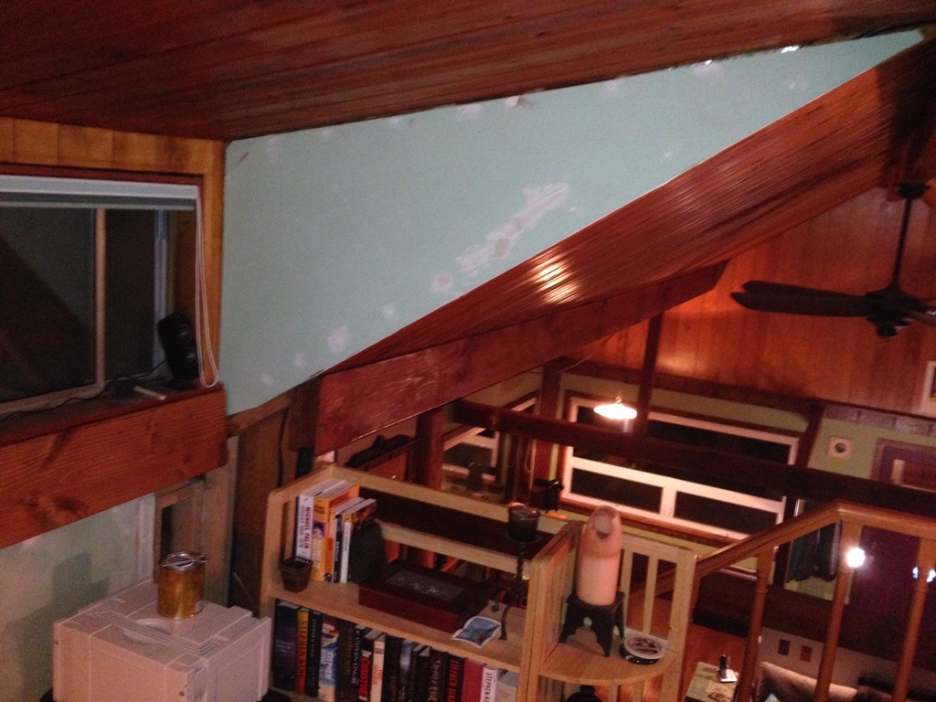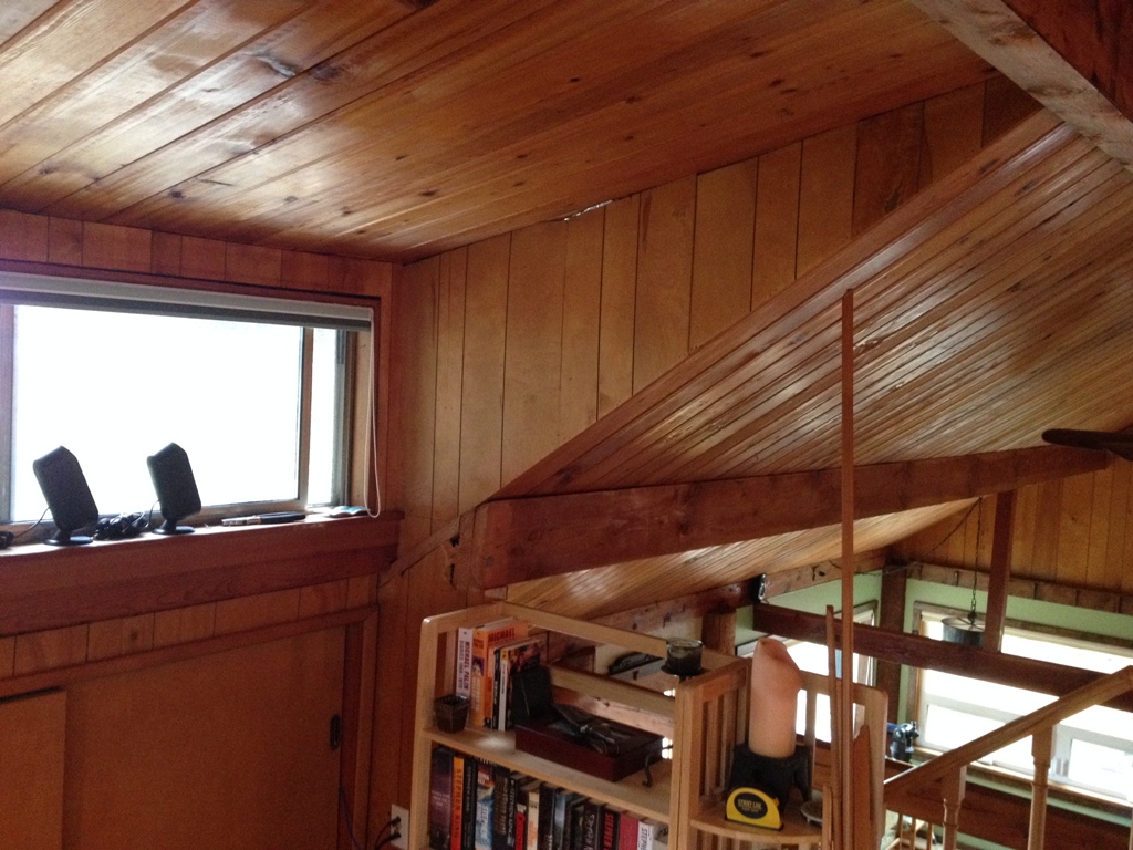 And see that gap between the beam and the ceiling timbers? The ceiling isn’t straight. My guess is when they made the dormer up here they didn’t support the roof correctly. They had to cut a load bearing beam to make this dormer so maybe that was their problem. Anyway, it’s now my problem and I need to find a way to either fix that gap or cover it up. There’s really nowhere to put the load of that roof anymore, so I’ll probably just cover it up.