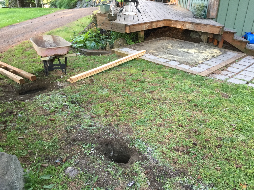 This ground is extremely rocky. You can’t dig 4″ without hitting a rock the size of your head. I had a rock in one hole that took me two days to excavate. At another location, I had to move my post over about 16 inches because there was a boulder down there and I didn’t have a stick of dynamite to break it with. But on the bright side, it’s been raining daily for about a month so the ground was nice and soft. About eight holes was all I had to dig.