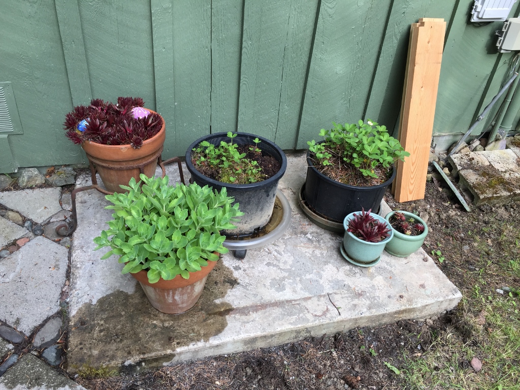 Strawberry, hens and chicks, sedum, … all deer food. And it’s all protected now, inside our little compound fence