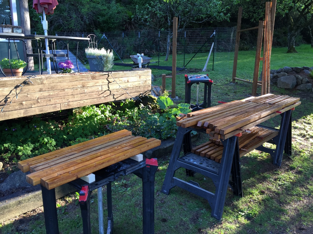 These are the 2×2 sticks to frame in the welded wire panels that will go into the fence. I wanted to saturate them in linseed oil before installation, such that all parts of them are completely protected. If you treat them after they’re installed, there are bare spots that water will eventually pool up inside and cause them to rot.