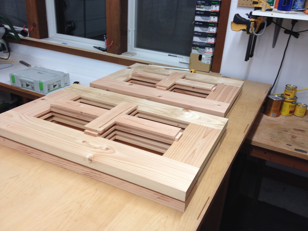 Here they are, all assembled. There’s a little hardware that needs to be installed but other than that they just need to be sanded and glued and stained and finished. And installed.