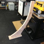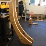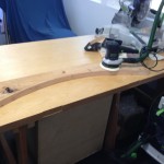 Here they are being cut and sanded down. No matter what you do to construction lumber, it’s always going to look like construction lumber. But if you cut and sand carefully and give it some crisp edges and shape it carefully, it doesn’t have to look like you have 2×12’s sticking out of your wall. I had some leftover sikkens, which is basically linseed oil with some pigment to it, and that worked great for wood treatment.