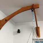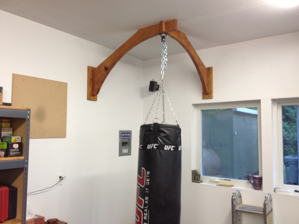 Once we built this garage, I didn’t think the joists would be strong enough by themselves to hold the bag up. They probably were, but the engineer in me really likes to over-fortify things. So I thought to make these large brackets to help spread the load out and stabilize the joists it hangs from.