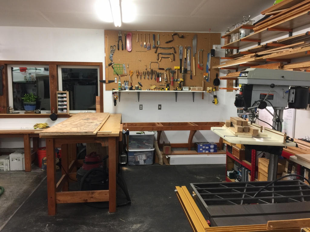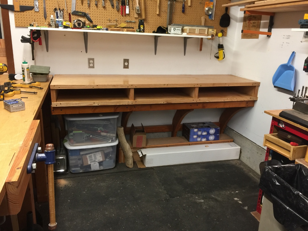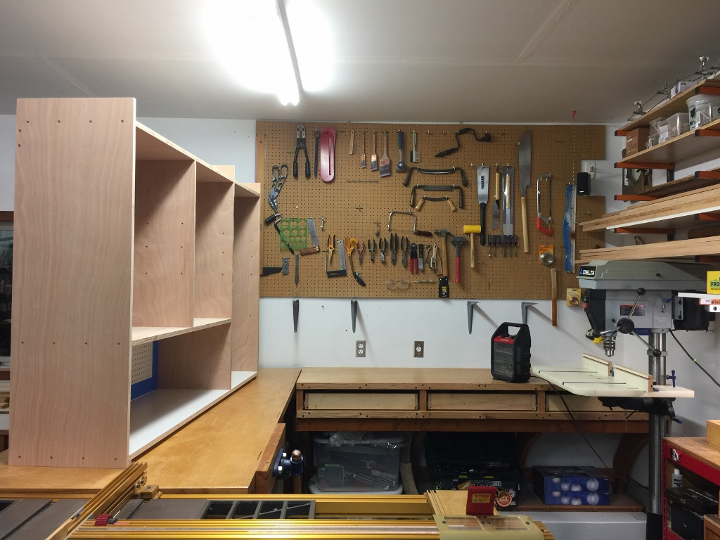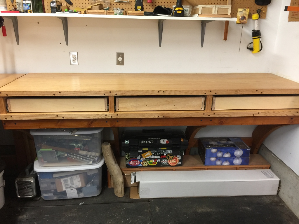 So, I have this little side table along that back wall, you can see it here with the brackets underneath. I’m reworking some storage and work surfaces in the shop and I wanted to raise that side table to the same height as the main bench. I figured the best way to do that was to built some boxes on top of it. And then I can make drawers!