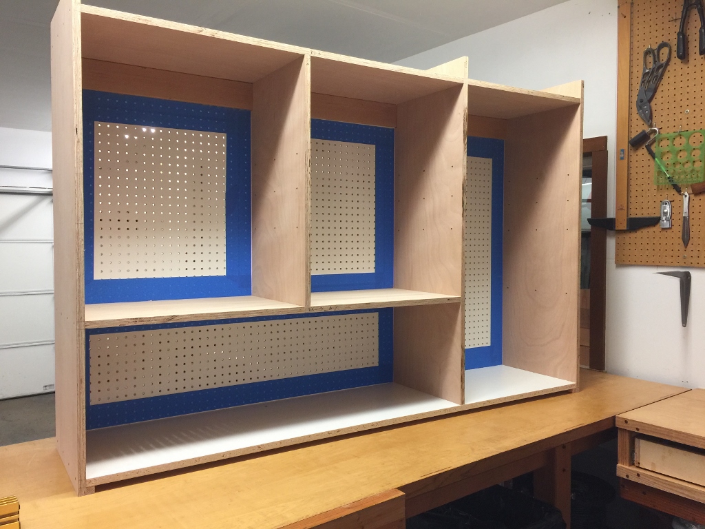 Big cabinets. They’re going to go where that awful brown pegboard is now. There will be under-cabinet lighting and doors that close and all sorts of fun stuff. I like using pegboard for cabinet backs, especially for utility cabinets, as you can hang crap on that back wall if you need to. Maximize your space.
