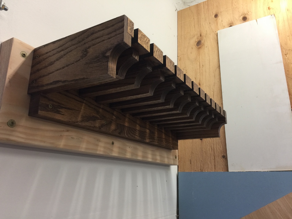 I’ve been badly in need of a new clamp rack. Of course, I make the biggest, heaviest monster clamp rack that I can. The top is 1″ thick solid oak and because I didn’t think that was strong enough I put some 1.5″ thick brackets underneath to reinforce them.