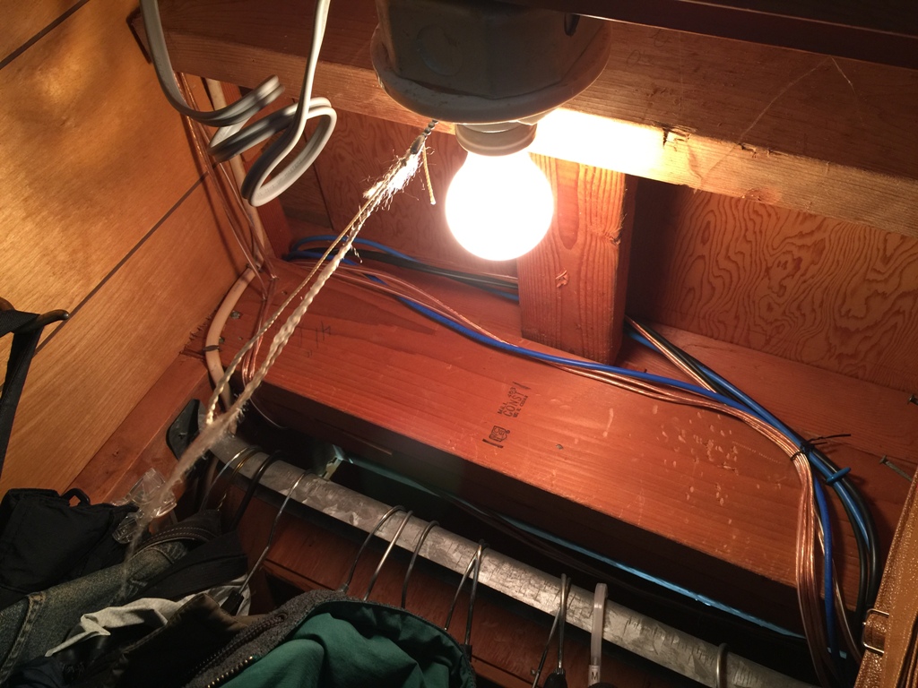 The bare bulb is actuated by a pull string so worn and frayed that it quietly sobs “kill me” whenever you grasp it. No effort has been made to conceal those exposed wires, or insulate them, or even bring them up to code. There is no code in the Closet of Doom, only a deep, eternal blackness that smells like dog pee and cigarette smoke.